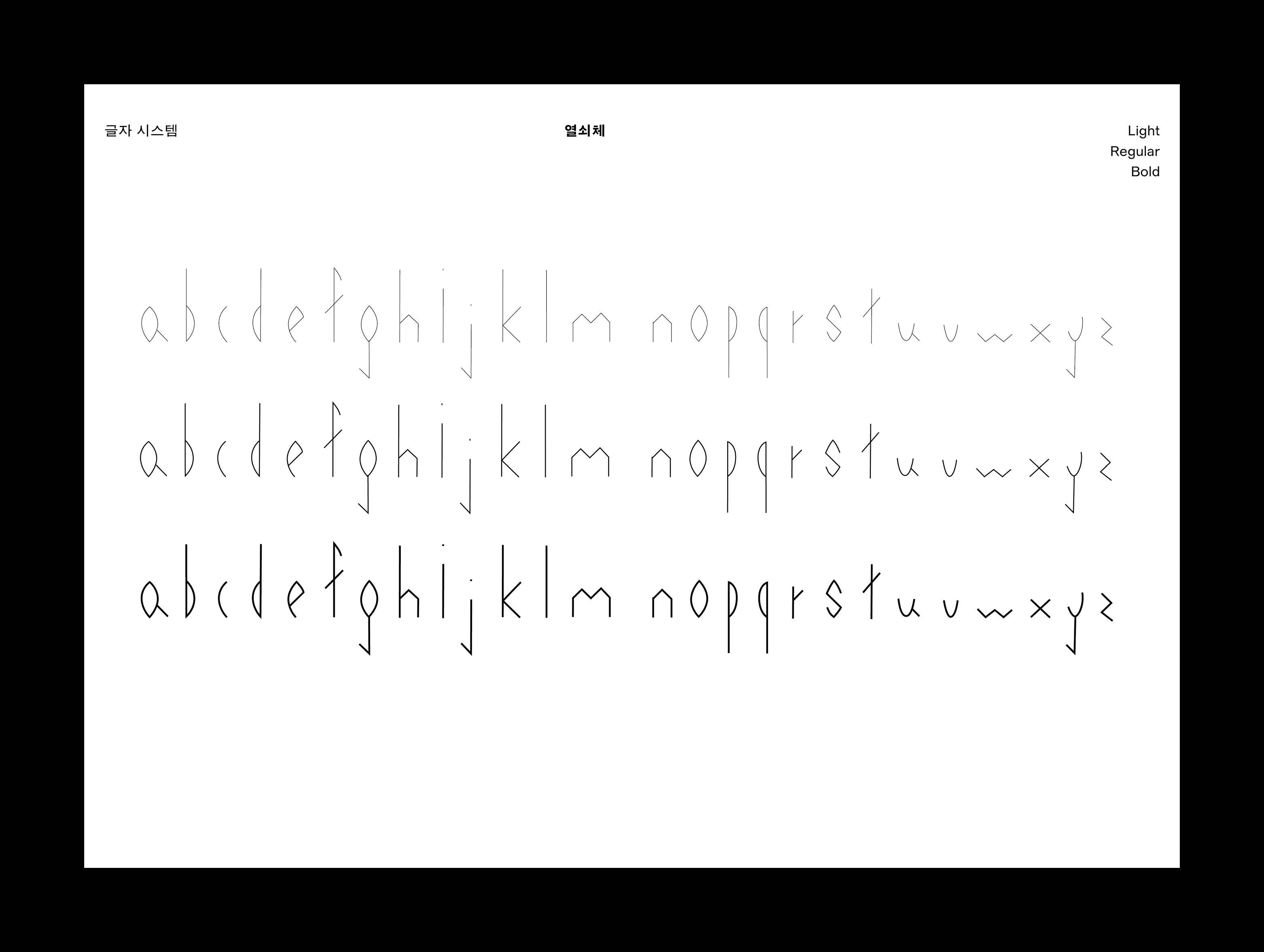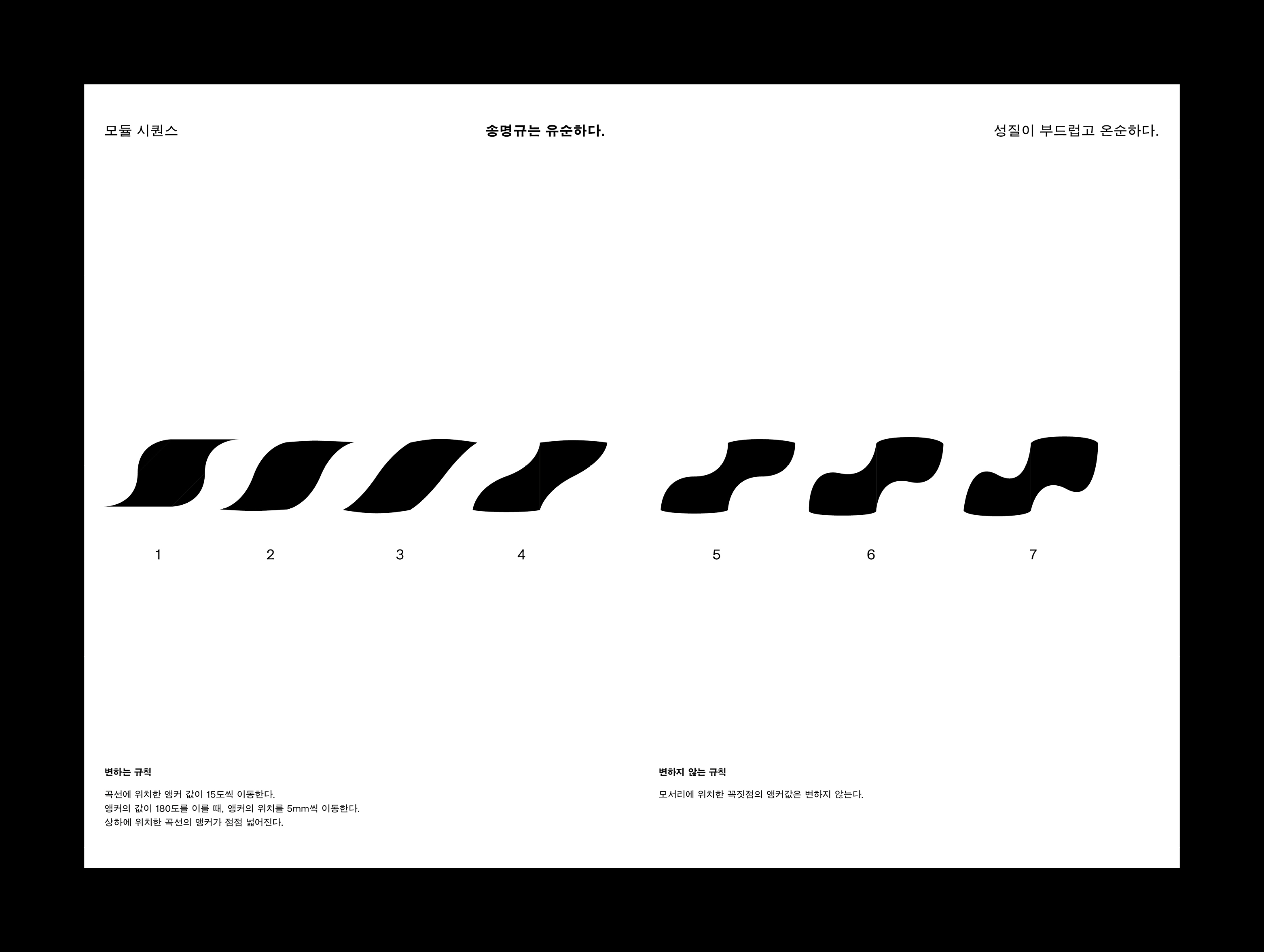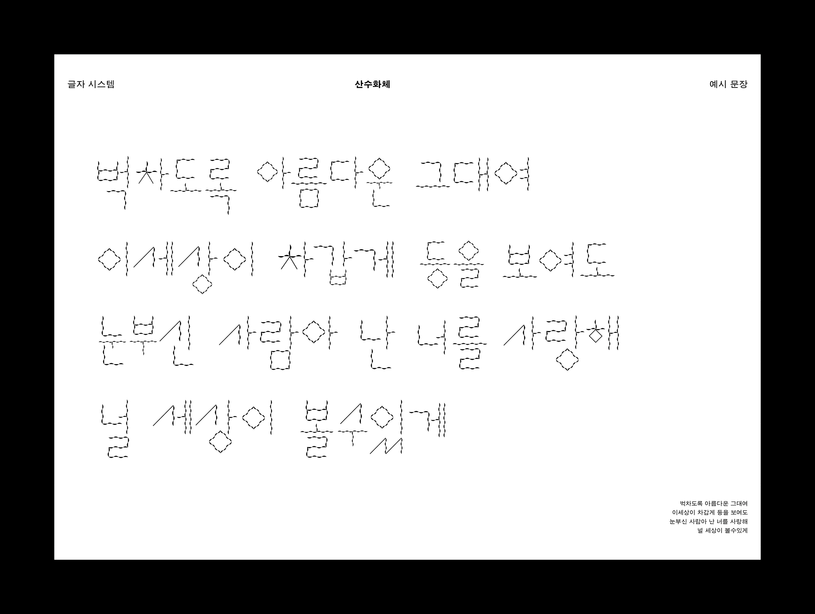 나를 표현한 30개의 문장에서 ‘유순’, ‘광대’, ‘인공위성’을 선택해 하나의 모듈을 만들어 이미지로 번역하는 작업을 진행하였다. 모듈을 패턴화하여 패턴 속에서 찾을 수 있는 유닛들을 조합하여 라틴 서체 ‘열쇠체’와 한글 서체 ‘산수화체’, 숫자 ‘발굽체’를 만들었다. 유닛과 모듈에서 활용한 규칙을 가져와 공원에서 만날 수 있는 친구들과 날씨를 표현하는 픽토그램을 만들었다.