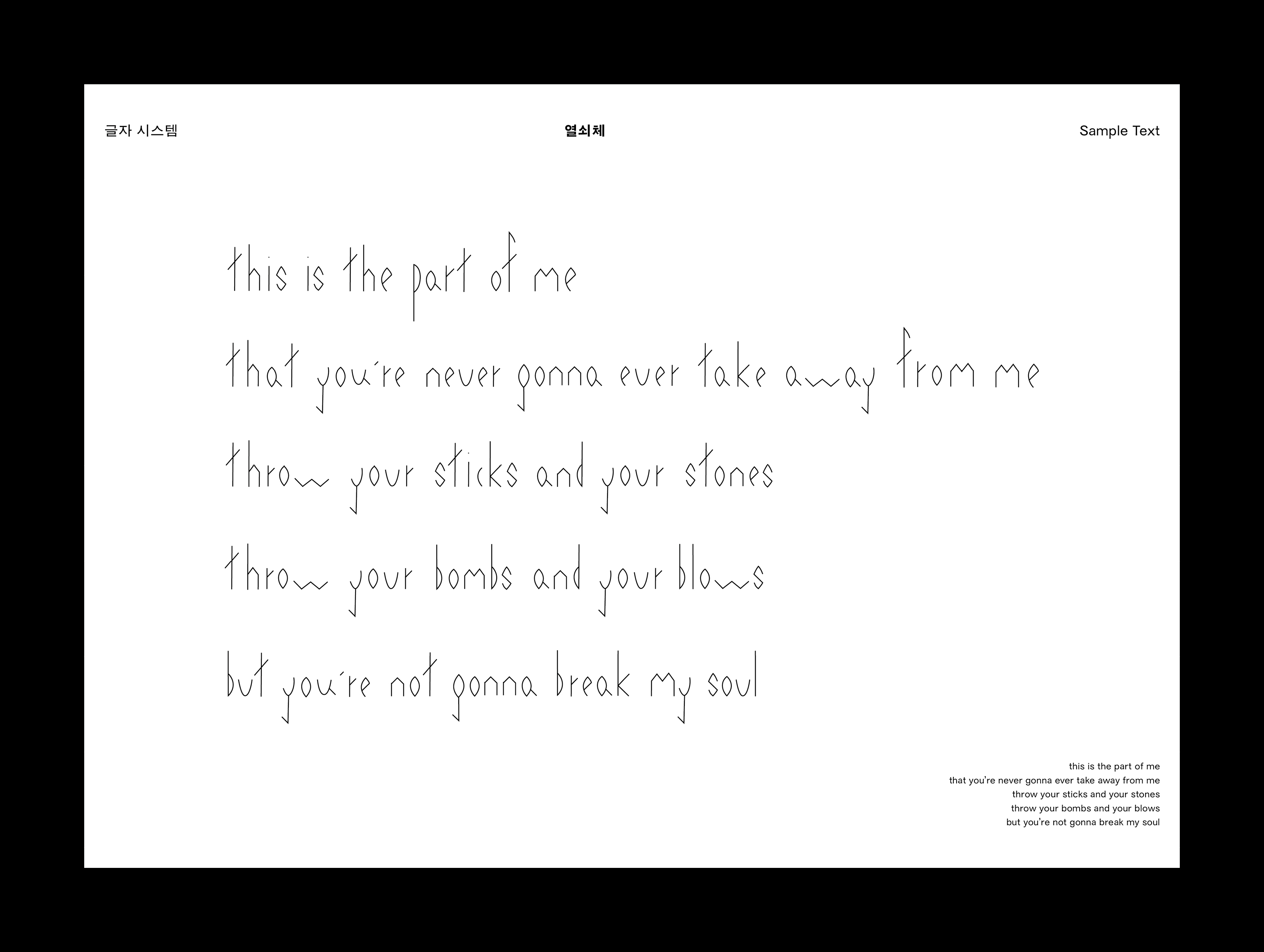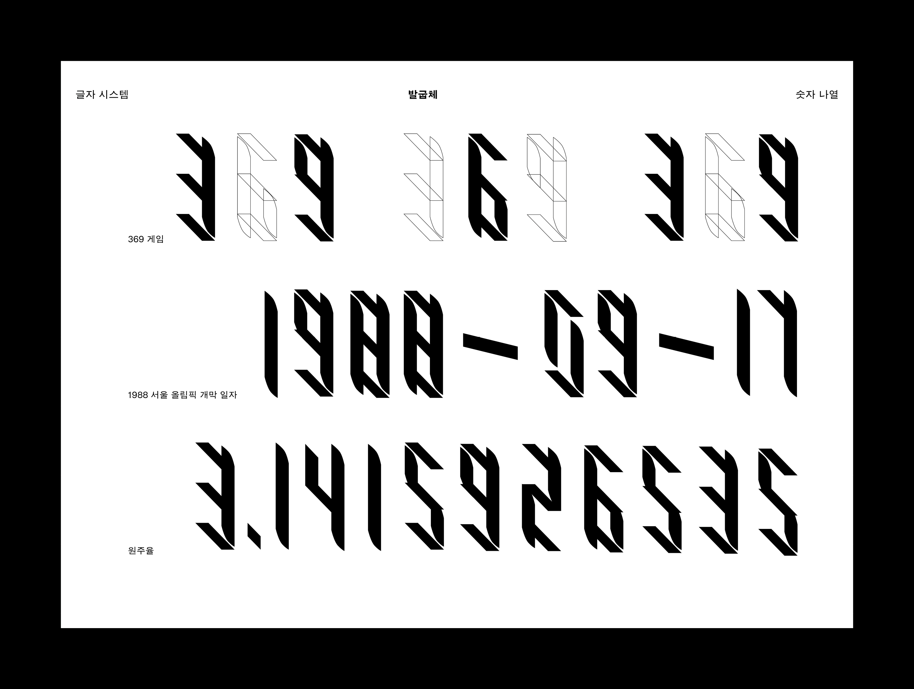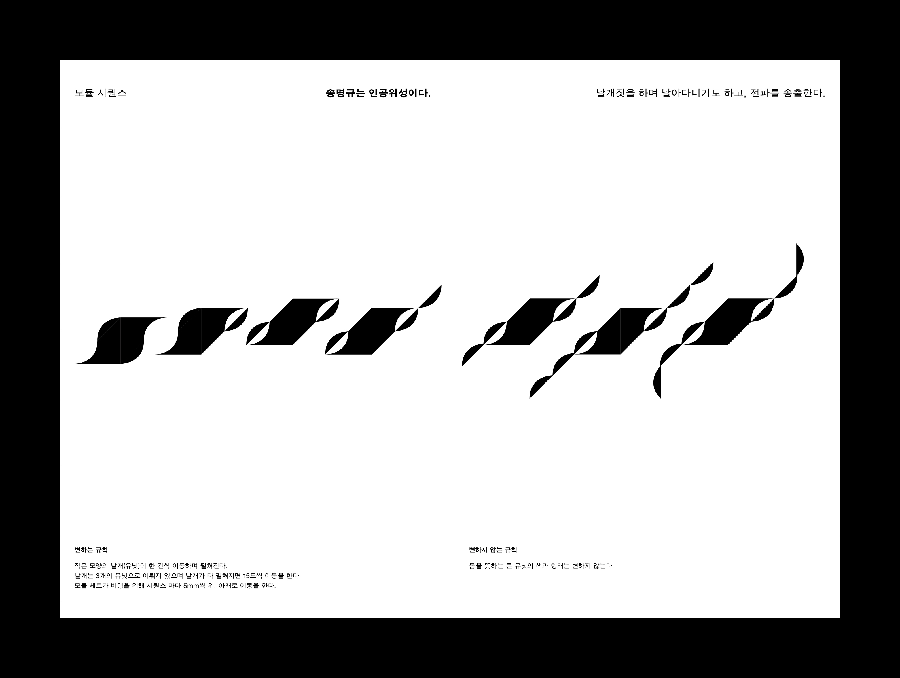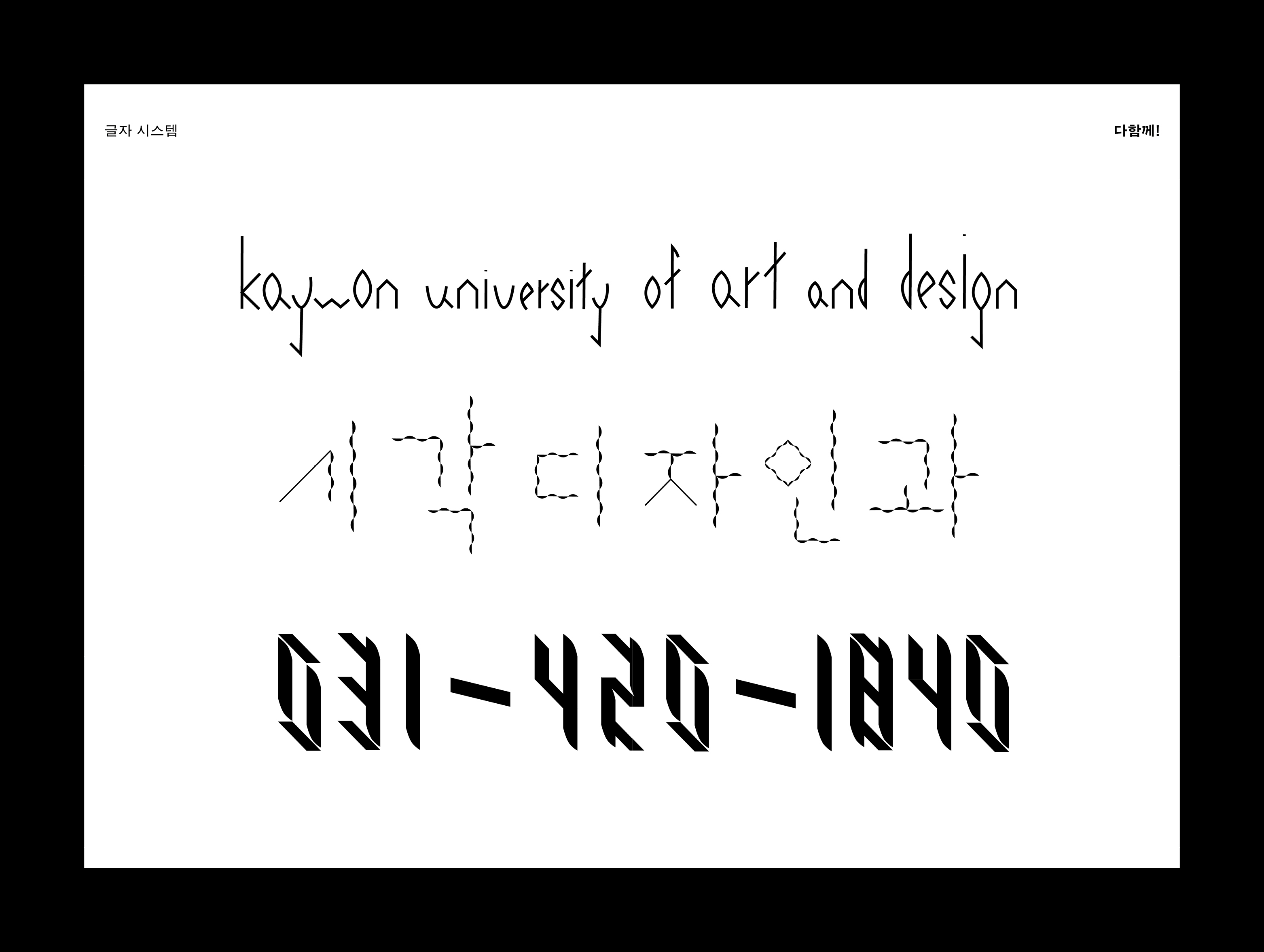 나를 표현한 30개의 문장에서 ‘유순’, ‘광대’, ‘인공위성’을 선택해 하나의 모듈을 만들어 이미지로 번역하는 작업을 진행하였다. 모듈을 패턴화하여 패턴 속에서 찾을 수 있는 유닛들을 조합하여 라틴 서체 ‘열쇠체’와 한글 서체 ‘산수화체’, 숫자 ‘발굽체’를 만들었다. 유닛과 모듈에서 활용한 규칙을 가져와 공원에서 만날 수 있는 친구들과 날씨를 표현하는 픽토그램을 만들었다.