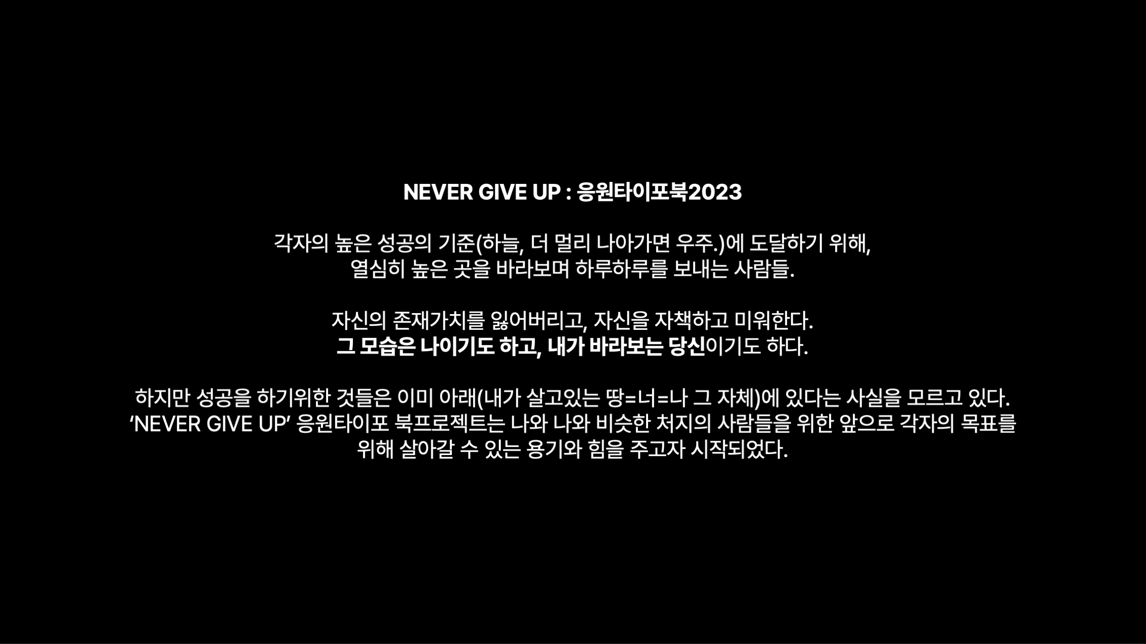 이번 다매체 타이포그래피 수업에서 'NEVER GIVE UP: CHEERING TYPO BOOK'이라는 프로젝트를 진행하게 되었습니다. 일단 저의 북 프로젝트는 성공의 높은 기준을 목표로 하루하루를 치열하게 살아가며 부딪치는 삶 속의 낮아지는 자존감과 회의를 느끼는 사람들을 위해 응원 메세지를 줄 수 있으면 좋겠다는 생각에서 시작되었습니다.