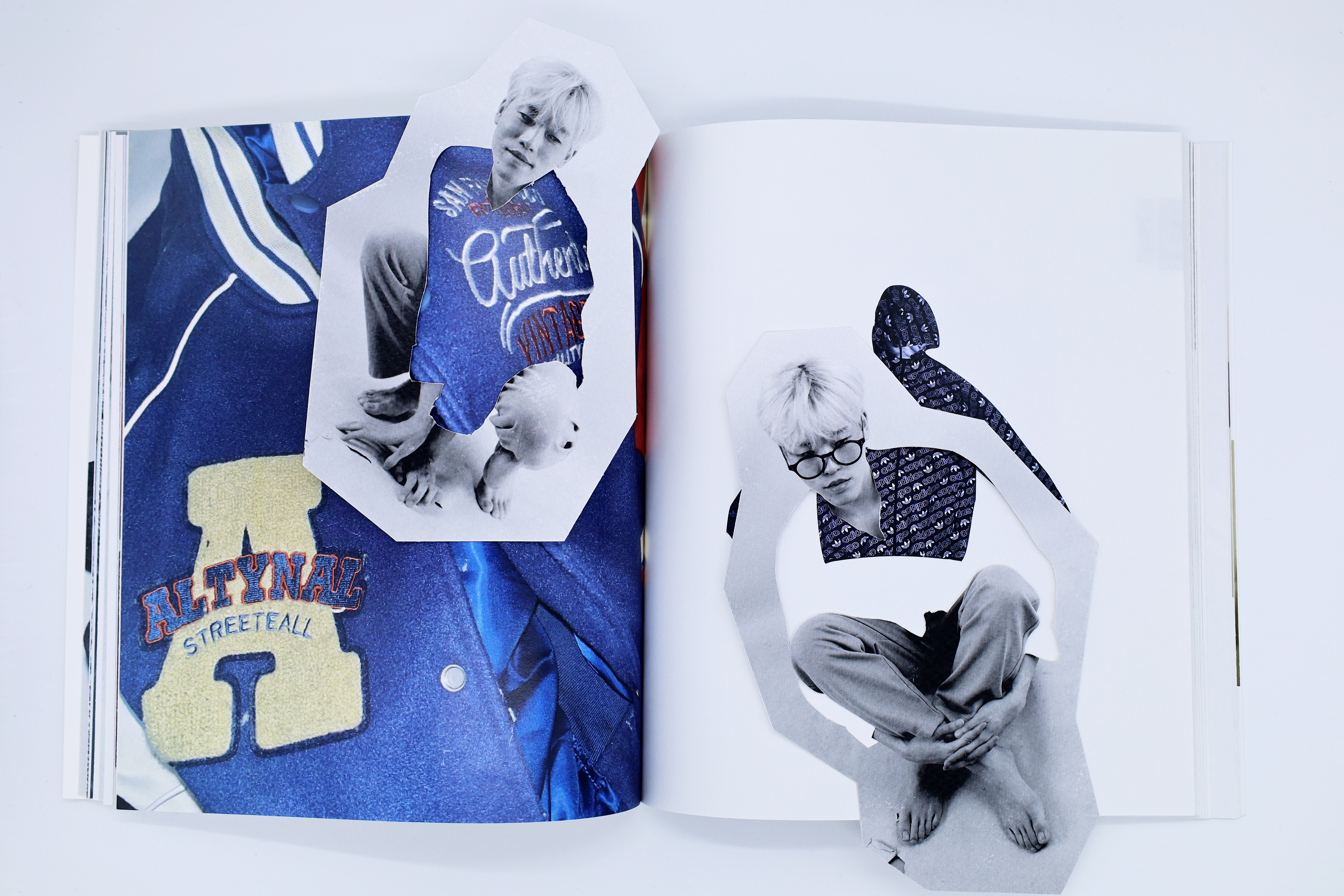 3권 - 벗어던지는 순간, 옷의 경계는 흐려지기 시작한다. 무작위로 한데 엉킨 부분과 전체는 옷과 옷감의 경계를 모호하게 만든다. 레터링은 완전히 뒤섞이고 뒤집히며 그 형체를 알아볼 수 없게 된다. 그 모든 비춤과 숨김들은 공중에서의 운동량에 따른 우연에 기인한다. 이를 수집할 매체로는 플래시 카메라를 사용한다.