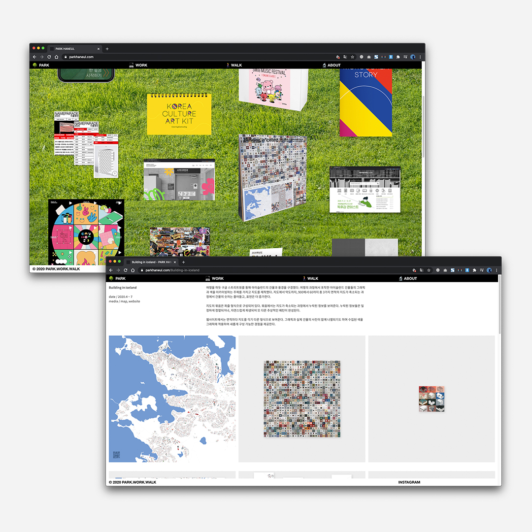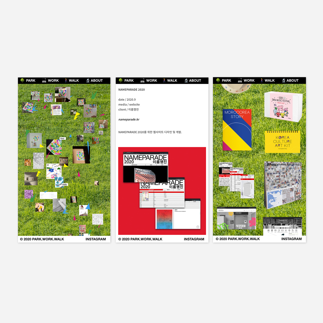 본인이 추구하고자 하는 디자인과 분위기의 특징을 직간접적으로 드러내며, 성이기도 한 ‘Park’를 스튜디오 이름이자 메인 키워드로 사용했다. 서명의 형태를 기하하적으로 재해석한 그래픽 요소는 웹사이트, SNS, 달력, 명함, AR 필터 등 다양한 매체로 확장된다.