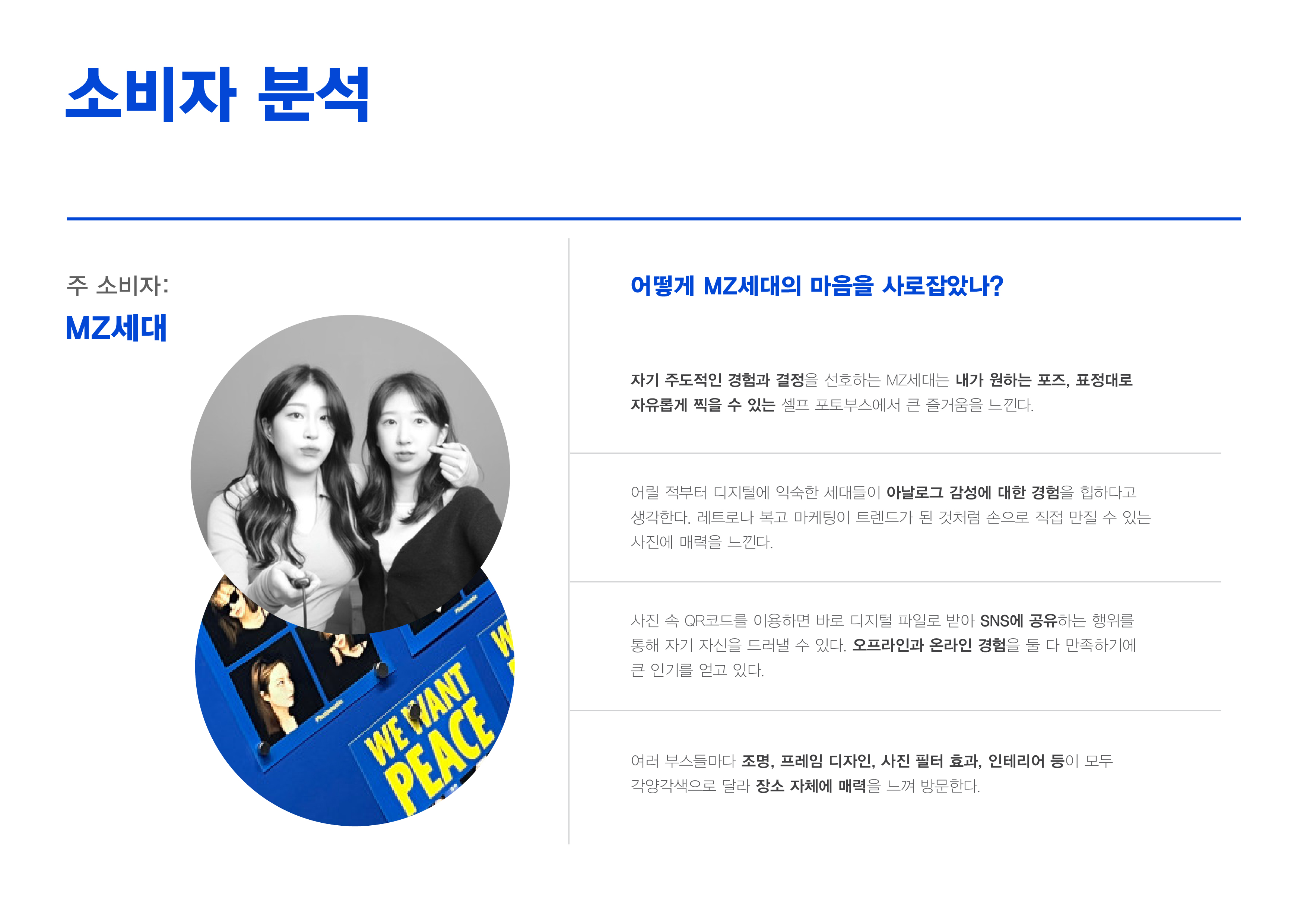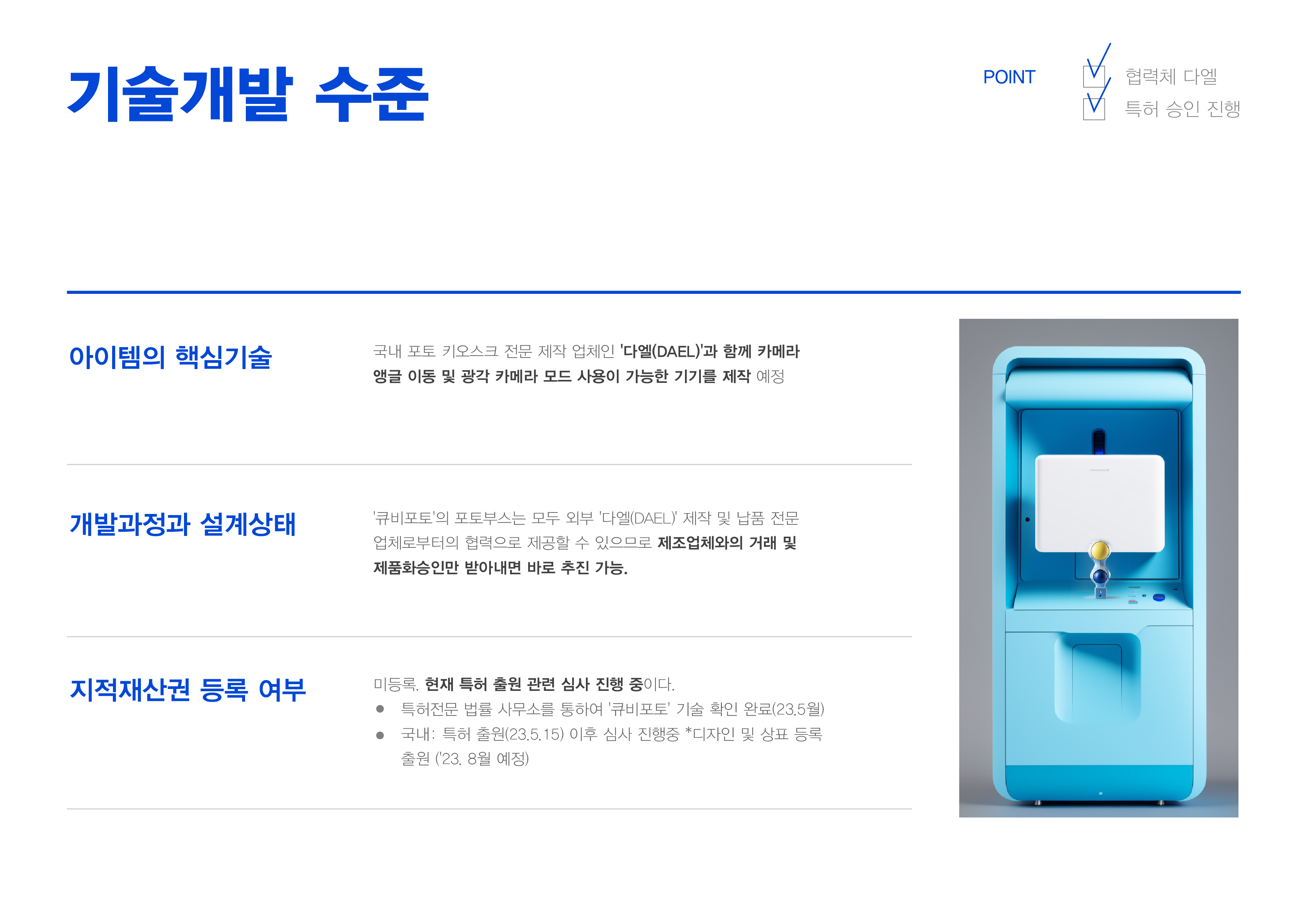 오늘날 무인 셀프 포토부스는 MZ세대의 놀이 문화로 자리 잡았다. 하지만 현재의 포토부스는 작은 렌즈와 고정된 각도의 카메라로 인해 다수가 촬영할 때 어려움이 있다. 그래서, 다수가 함께 즐길 수 있고 여러 각도로 다양한 촬영을 할 수 있는 서비스 ‘큐비포토’를 사업 아이템으로 설정하여 사업 계획서를 작성했다.