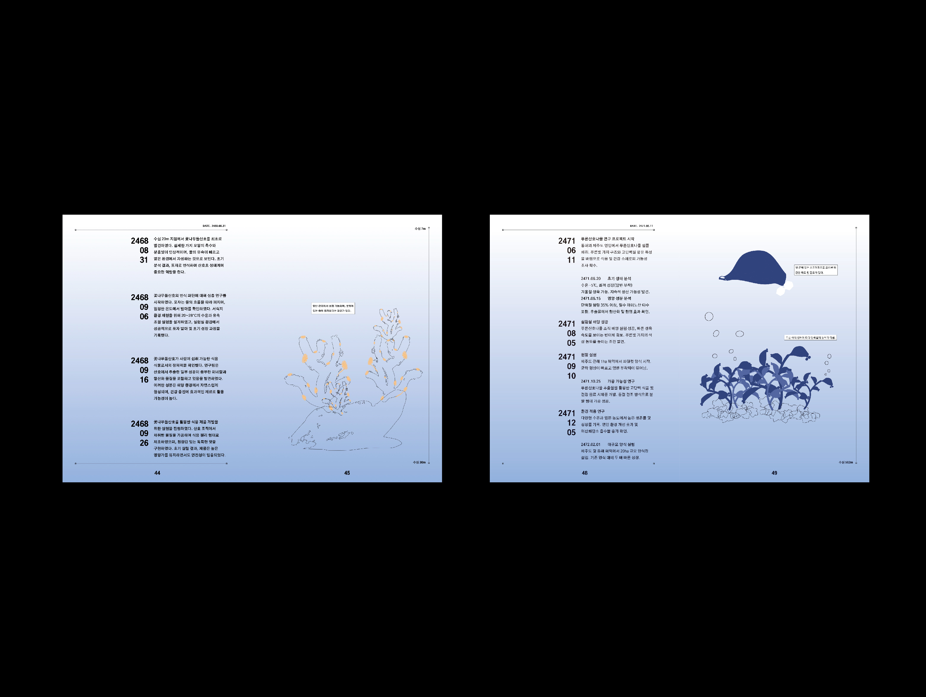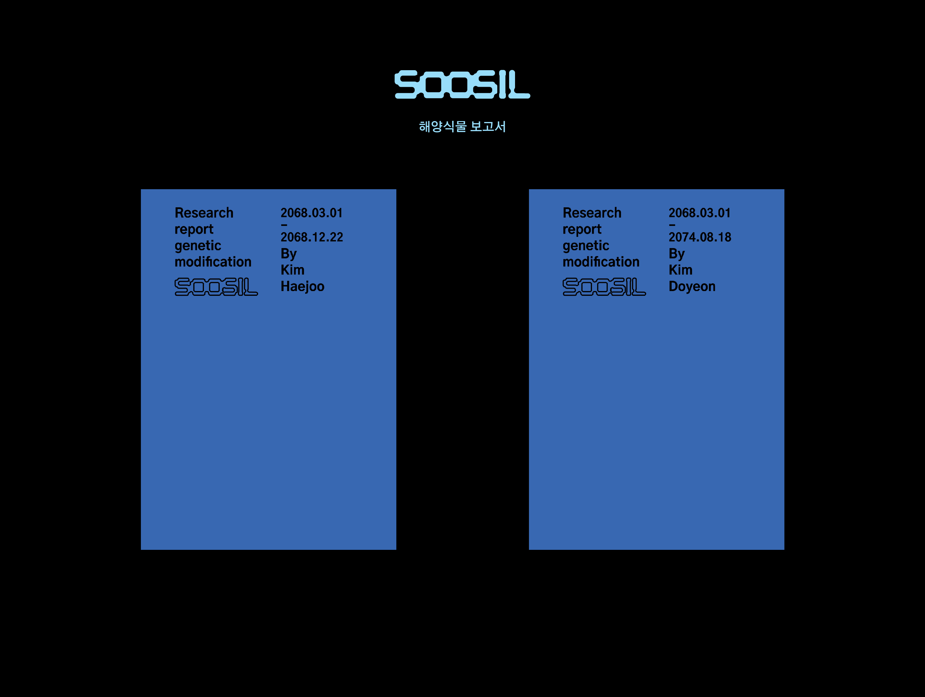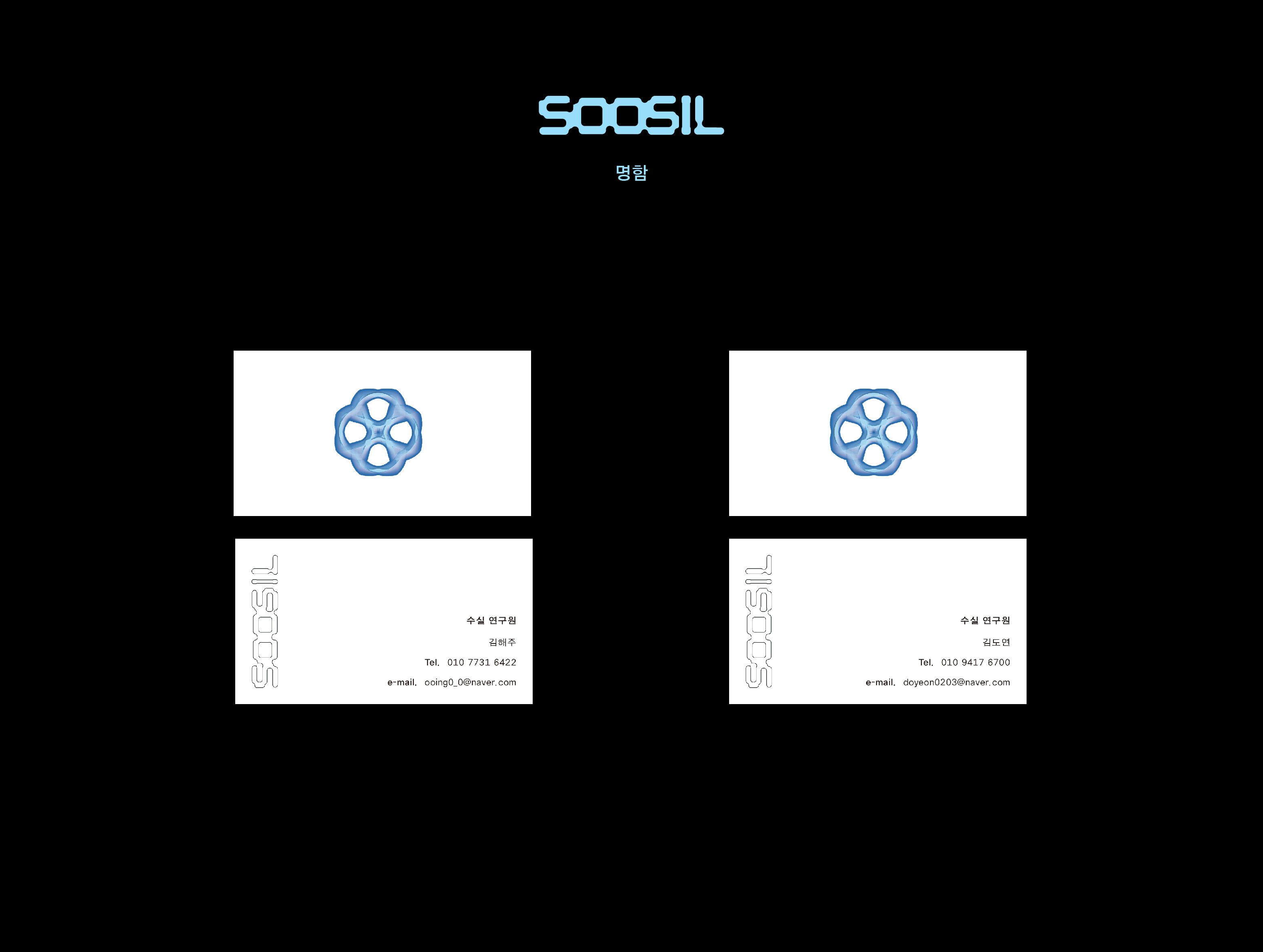 웹사이트는 SOOSIL의 직원들이 사용하는 작업화면을 구현한 것입니다. 가장 상단의 영상으로 첨부하였습니다. 책자는 SOOSIL의 직원들이 연구하던 해양식물들의 보고서를 책자로 만들었습니다. 마지막으로 각자의 명함을 만들었습니다.