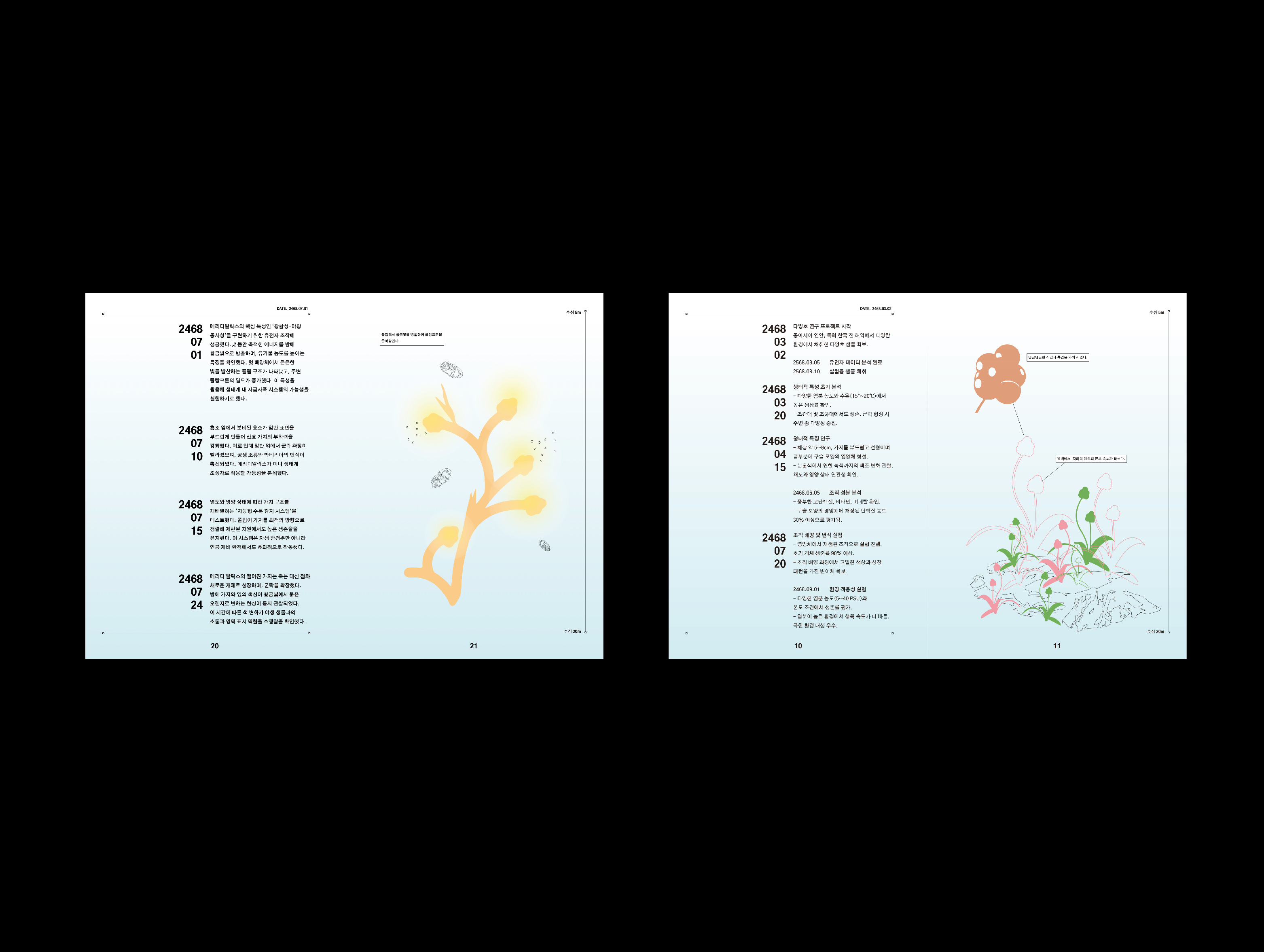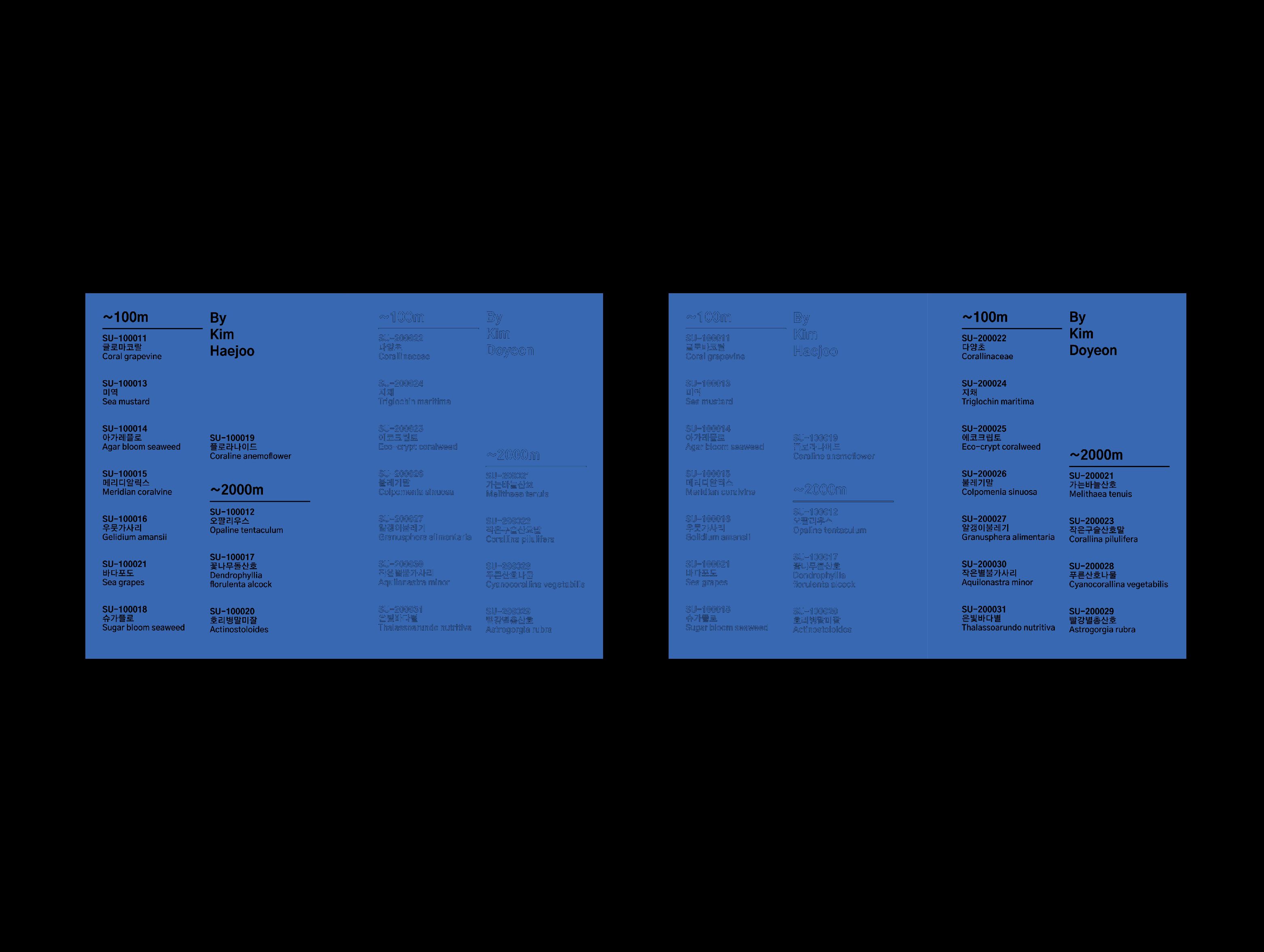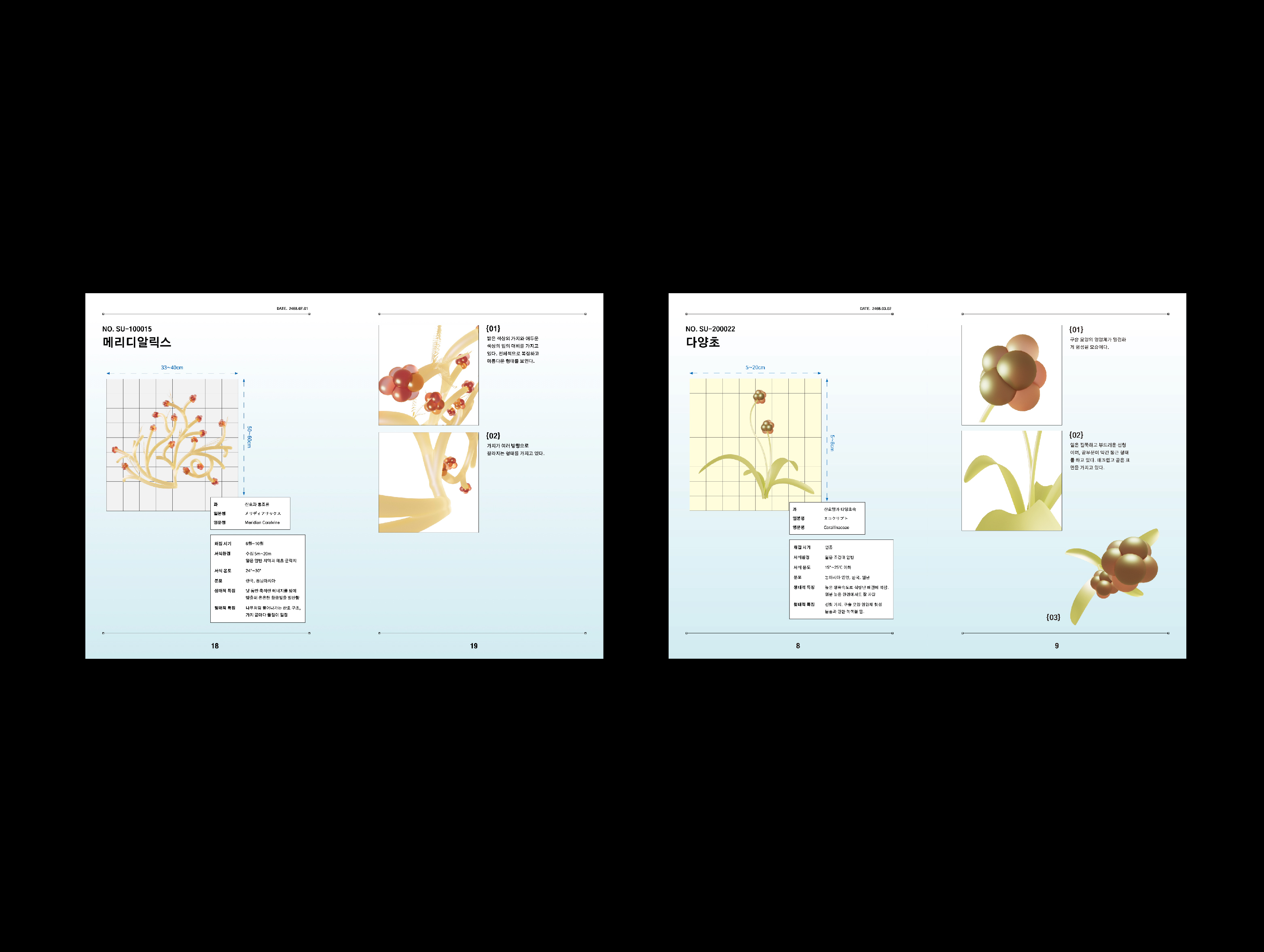 웹사이트는 SOOSIL의 직원들이 사용하는 작업화면을 구현한 것입니다. 가장 상단의 영상으로 첨부하였습니다. 책자는 SOOSIL의 직원들이 연구하던 해양식물들의 보고서를 책자로 만들었습니다. 마지막으로 각자의 명함을 만들었습니다.