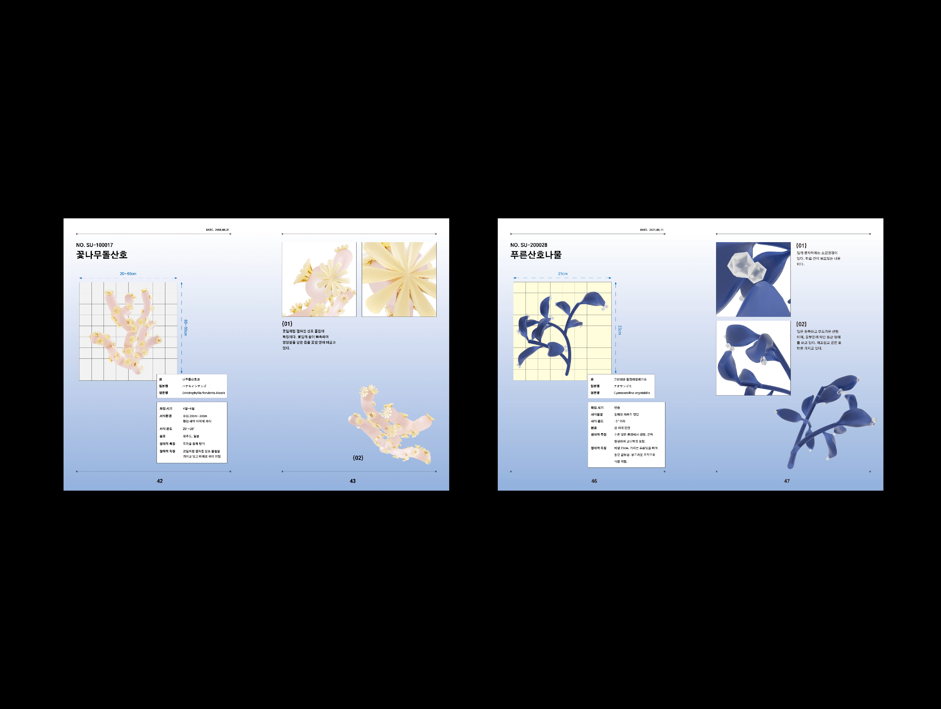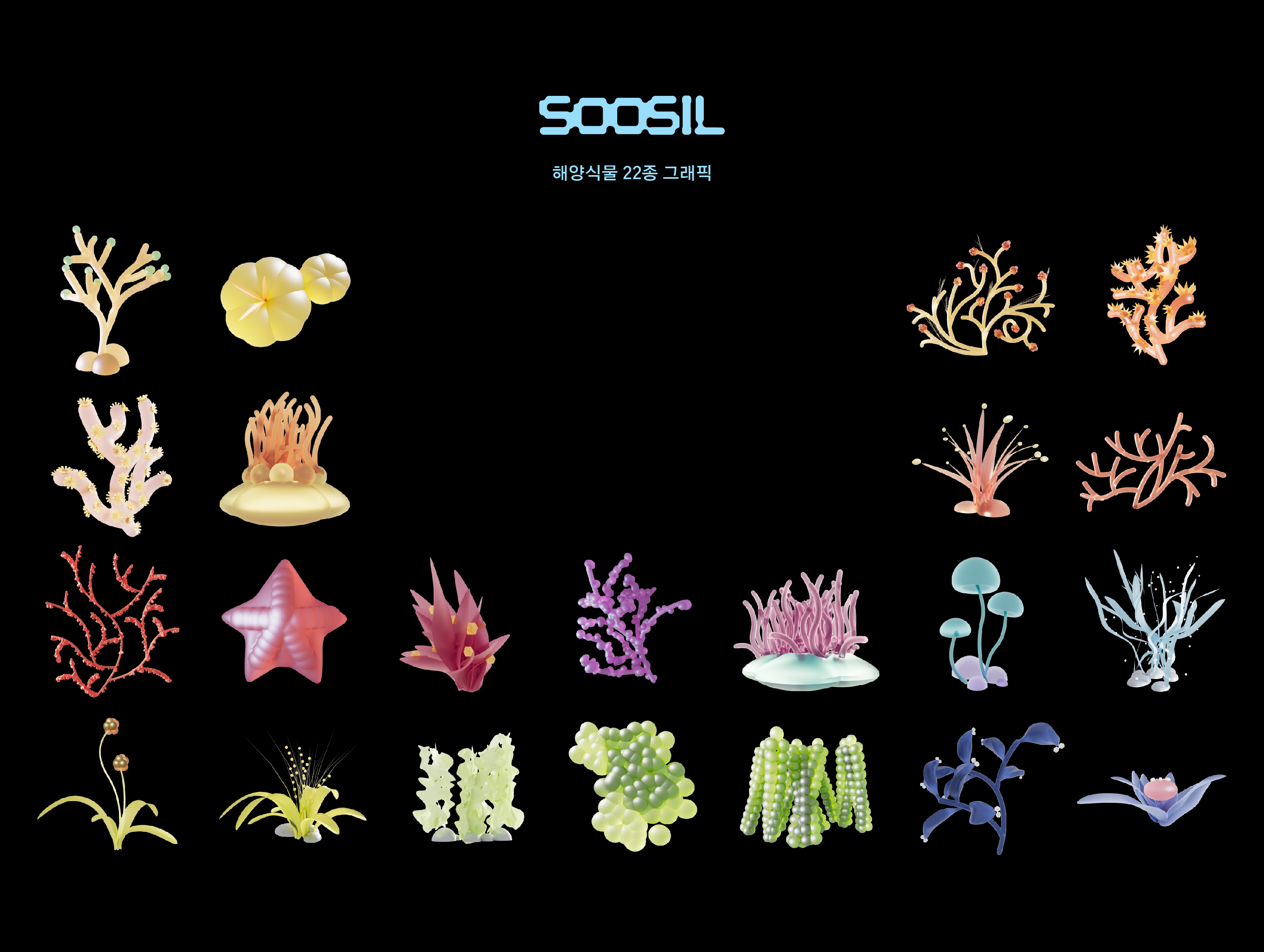 웹사이트와 책자를 만들기 위해서는 해양식물을 먼저 만들어내야 했습니다. SOOSIL의 해양식물을 만들기 위해 우리는 각자 6종씩 기존의 해양식물을 조사했습니다. 그리고 Chat GPT에 각자 조사한 6종을 입력한 후 그 속에서 새로운 해양식물을 만들어달라고 요구하였습니다. 그렇게 각자 11종씩, 총 22종의 해양식물을 3D그래픽으로 만들어냈습니다.