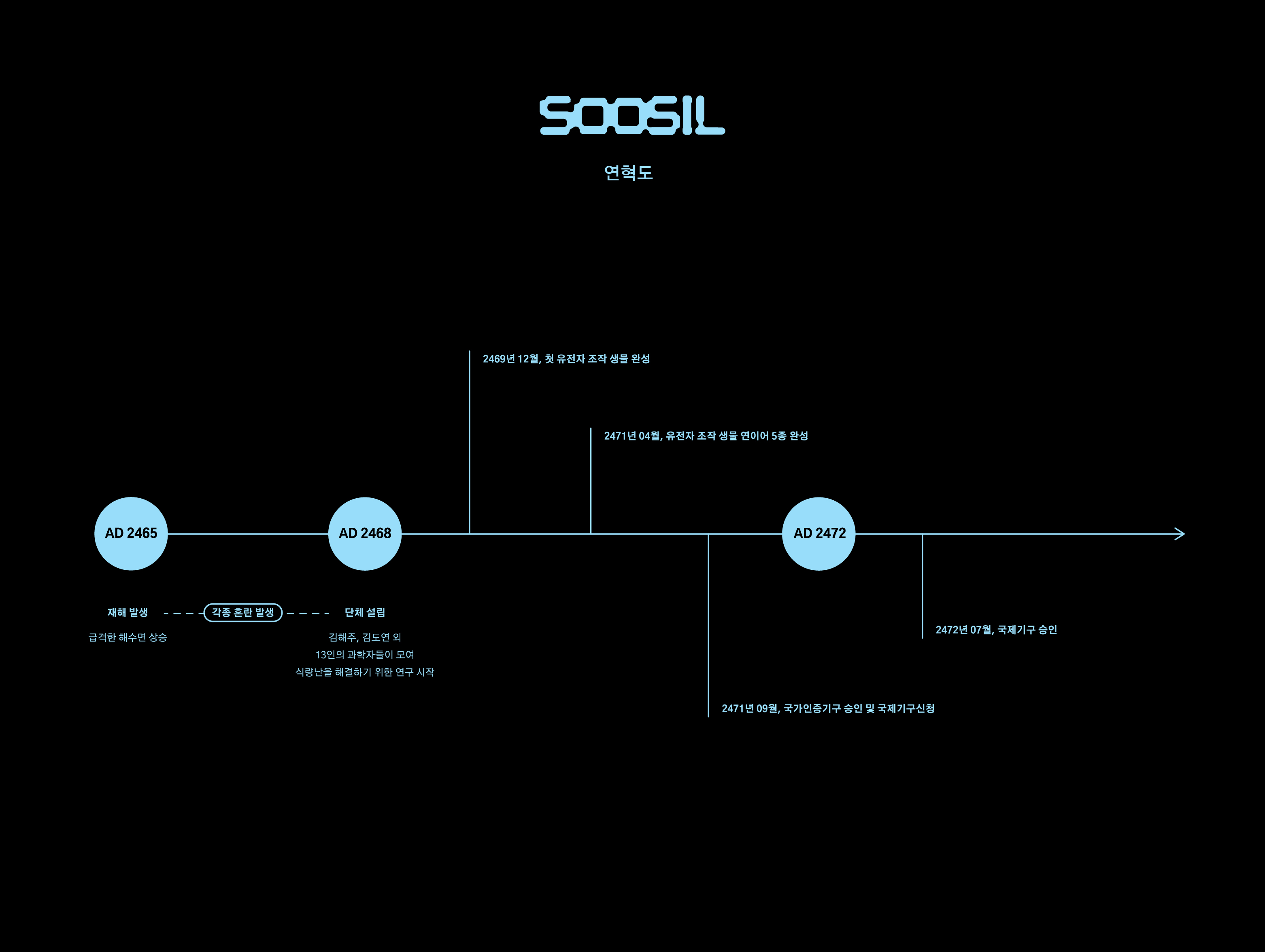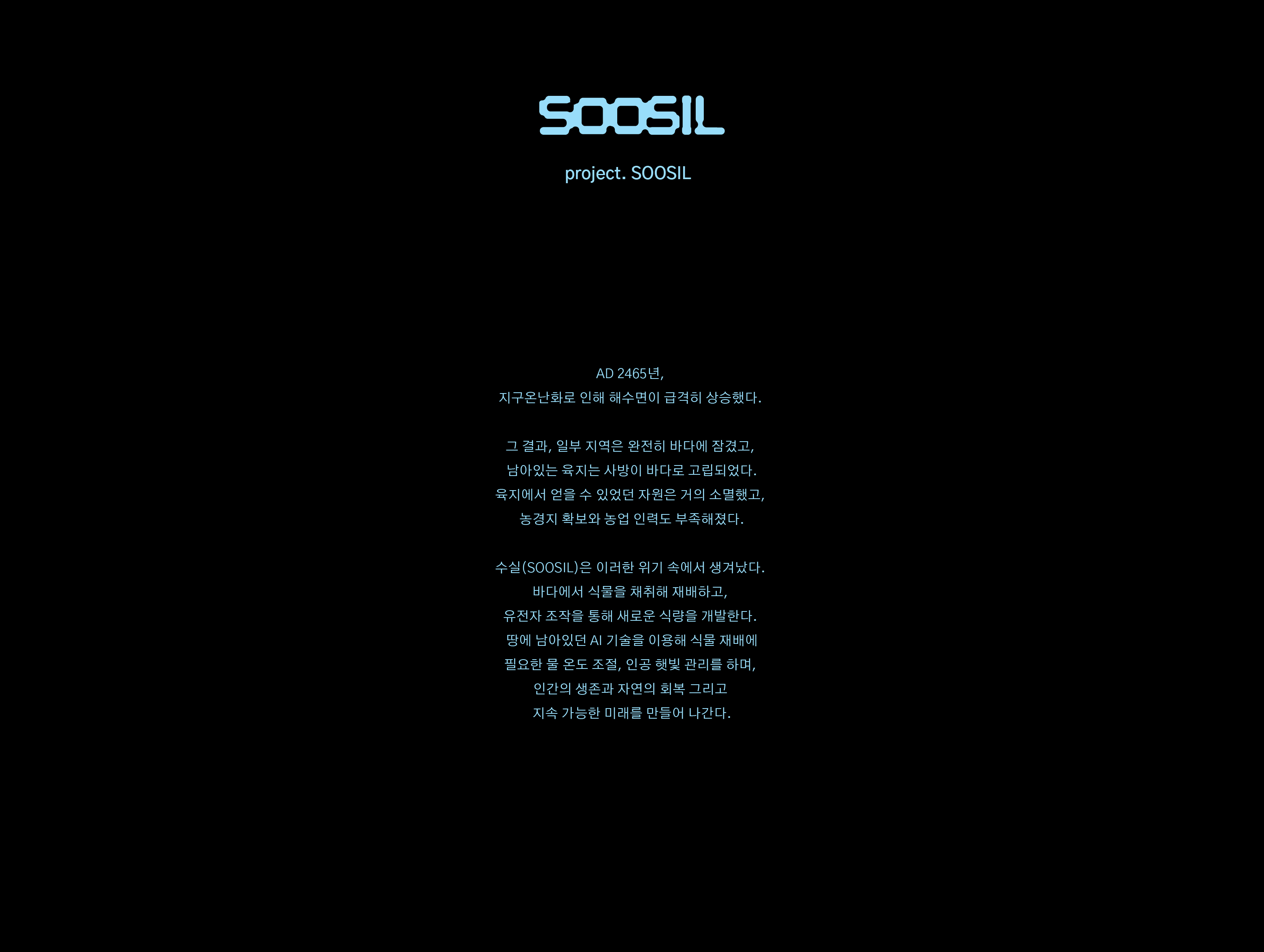 해수면 상승으로 인해 환경이 바뀌고 기존의 식물들은 살아가기 힘들어지며 자연스레 식량난으로 이어집니다. 하지만 그 속에서도 인류는 해양식물들을 연구하고 개조하여 많은 사람들이 먹고 살아갈 수 있도록 노력할 것입니다. SOOSIL은 해양식물을 연구하는 가장 첫 번째 연구소입니다. 그리고 SOOSIL은 앞으로도 인류의 보존을 위해 해양식물의 연구를 이어 나갈 것입니다.
