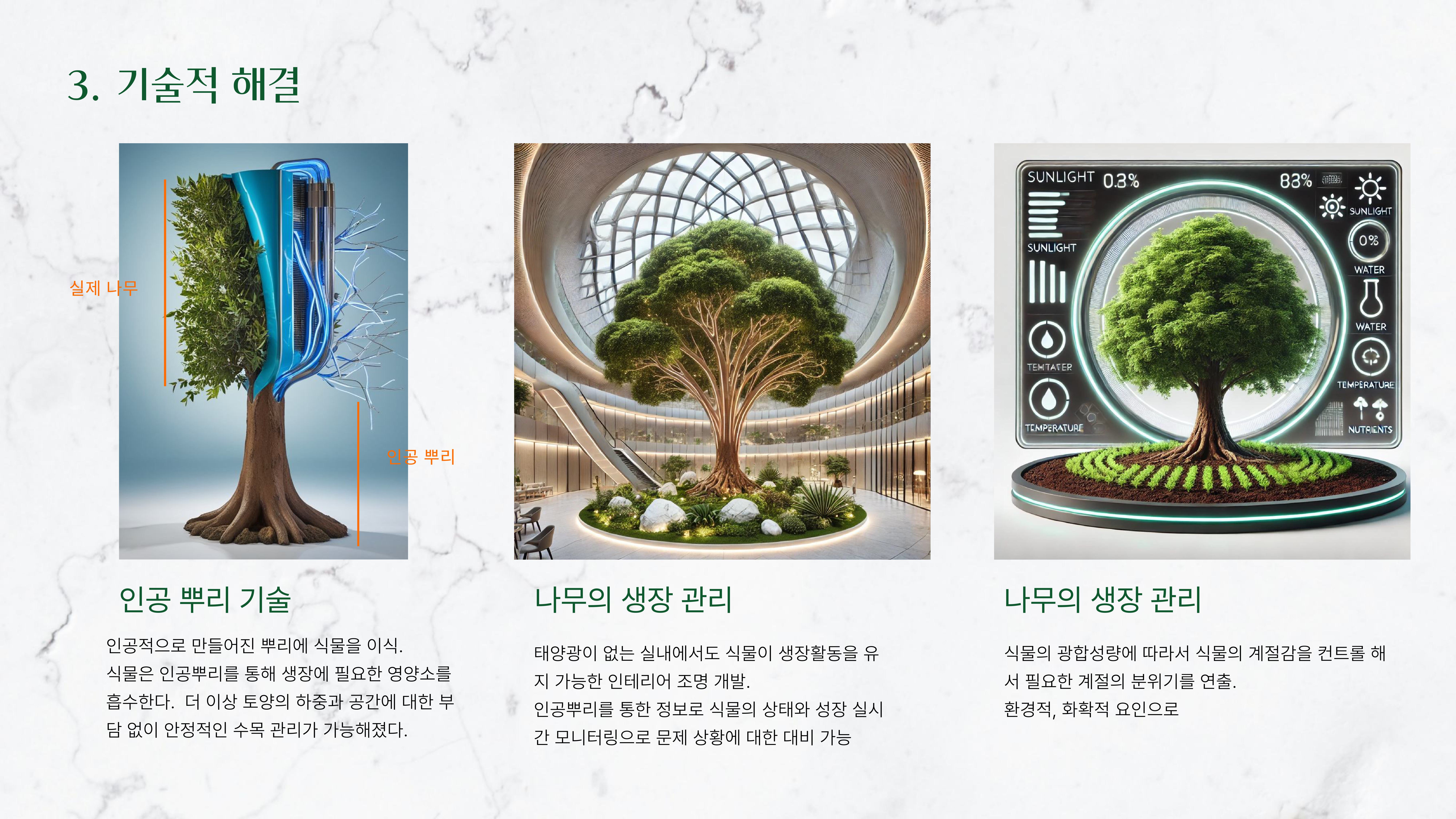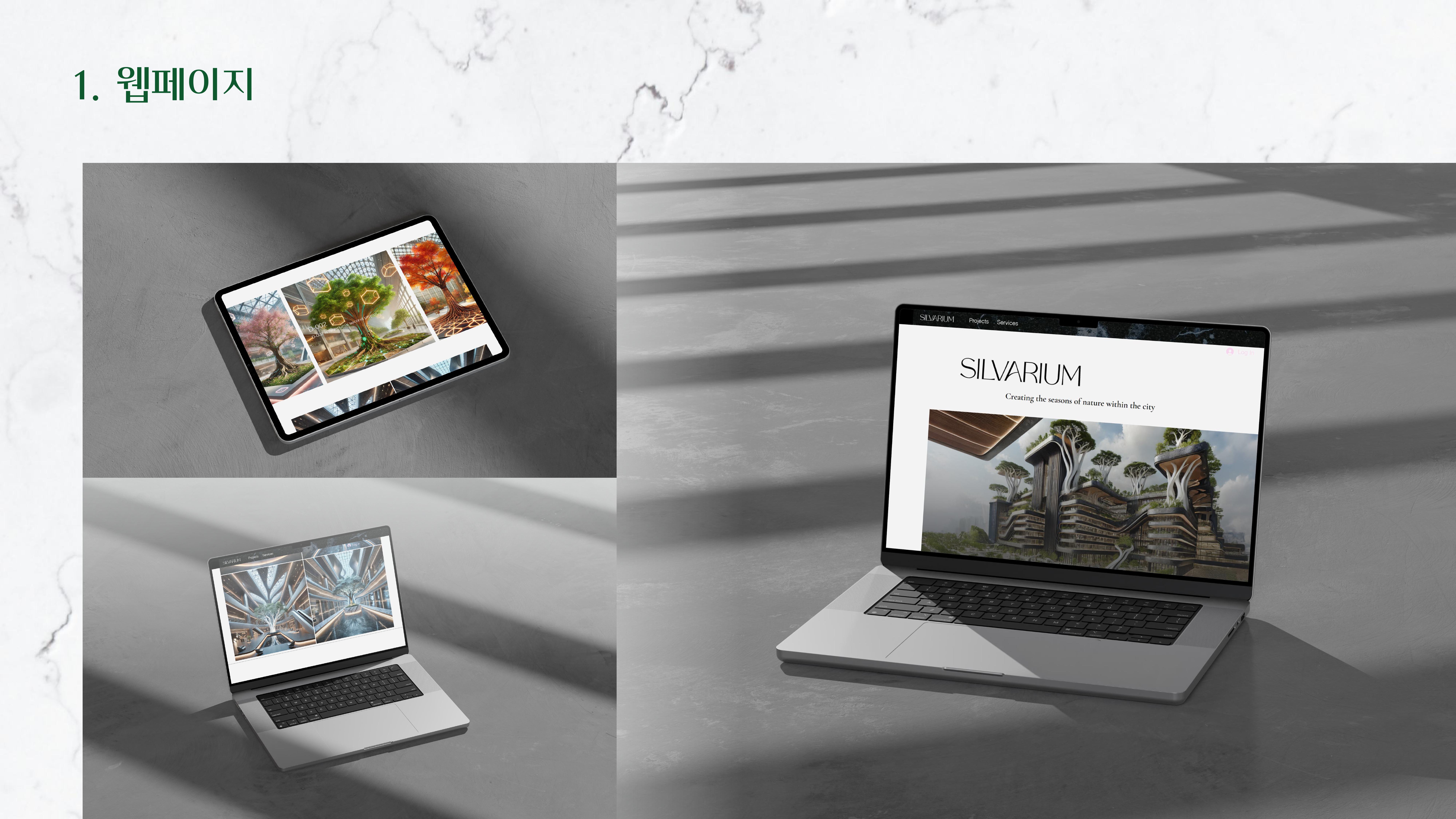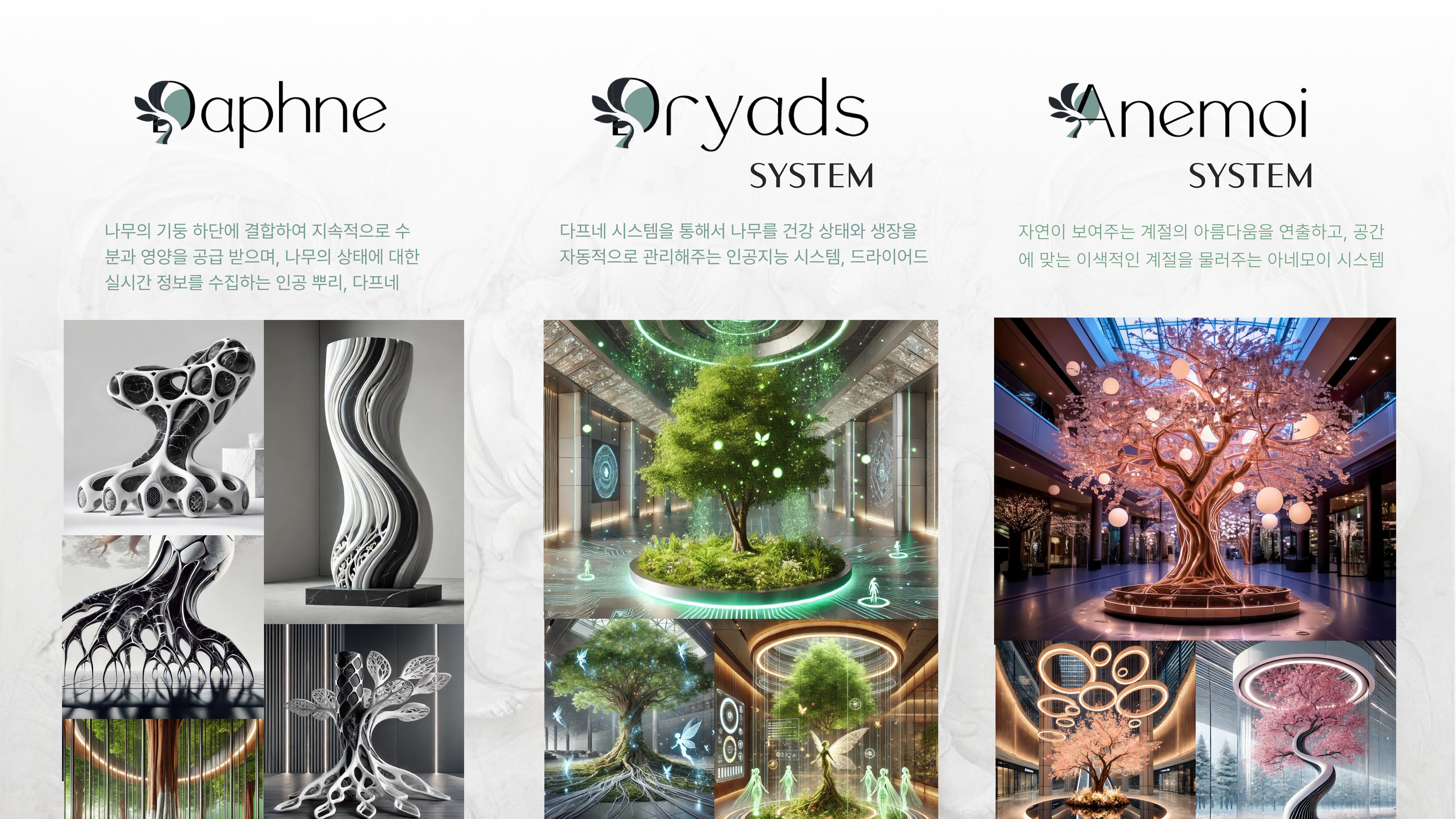 Silvarium과 그 하위 시스템(Dafne, Dryads, Anemoi)에 대한 기획과 브랜딩을 진행했습니다. Dafne은 수목을 실내로 들이는 인공뿌리 임플랜트 시스템, Dryads는 실내 정원 관리 기술, Anemoi는 계절감을 극대화한 연출 솔루션입니다.