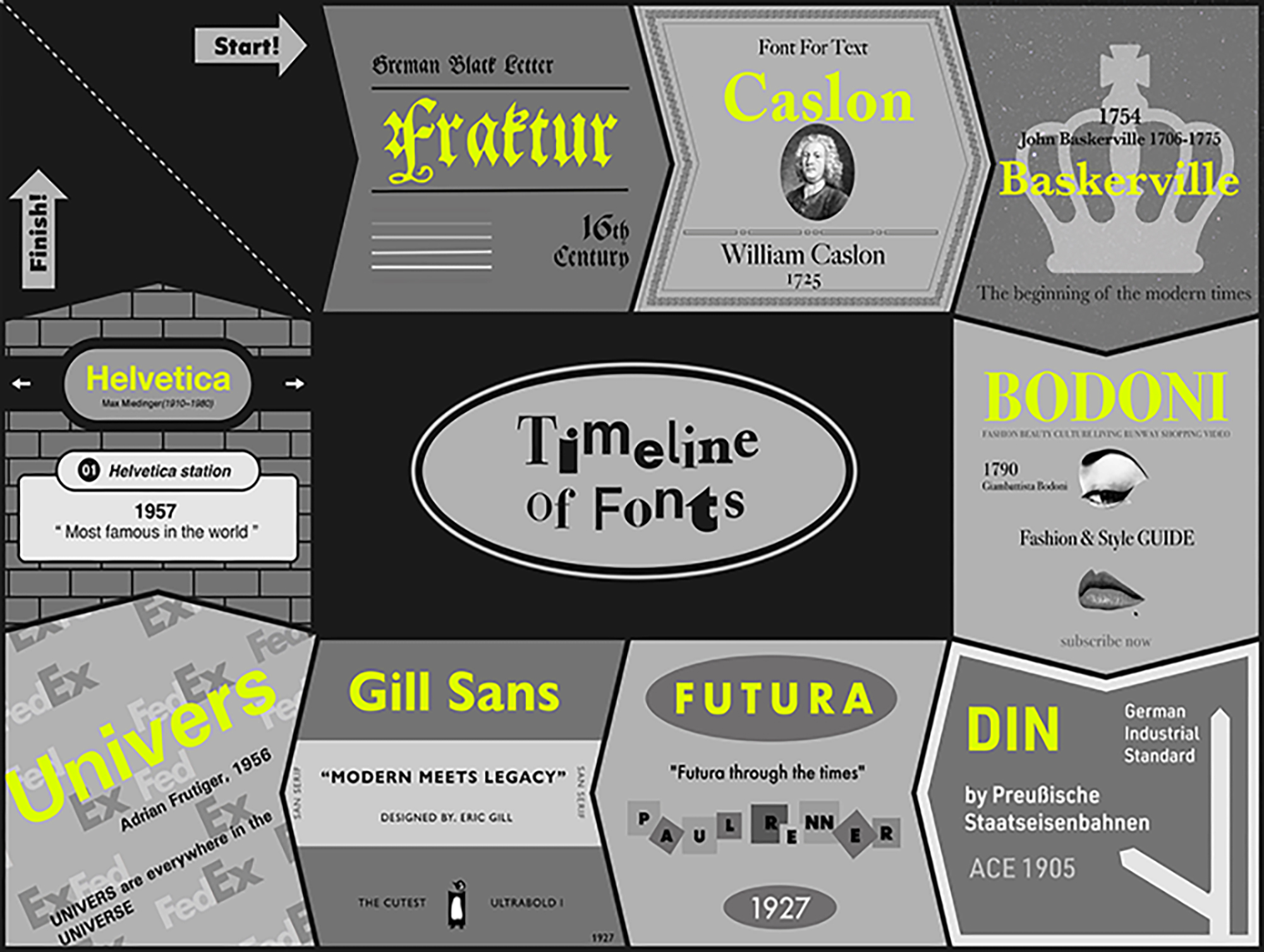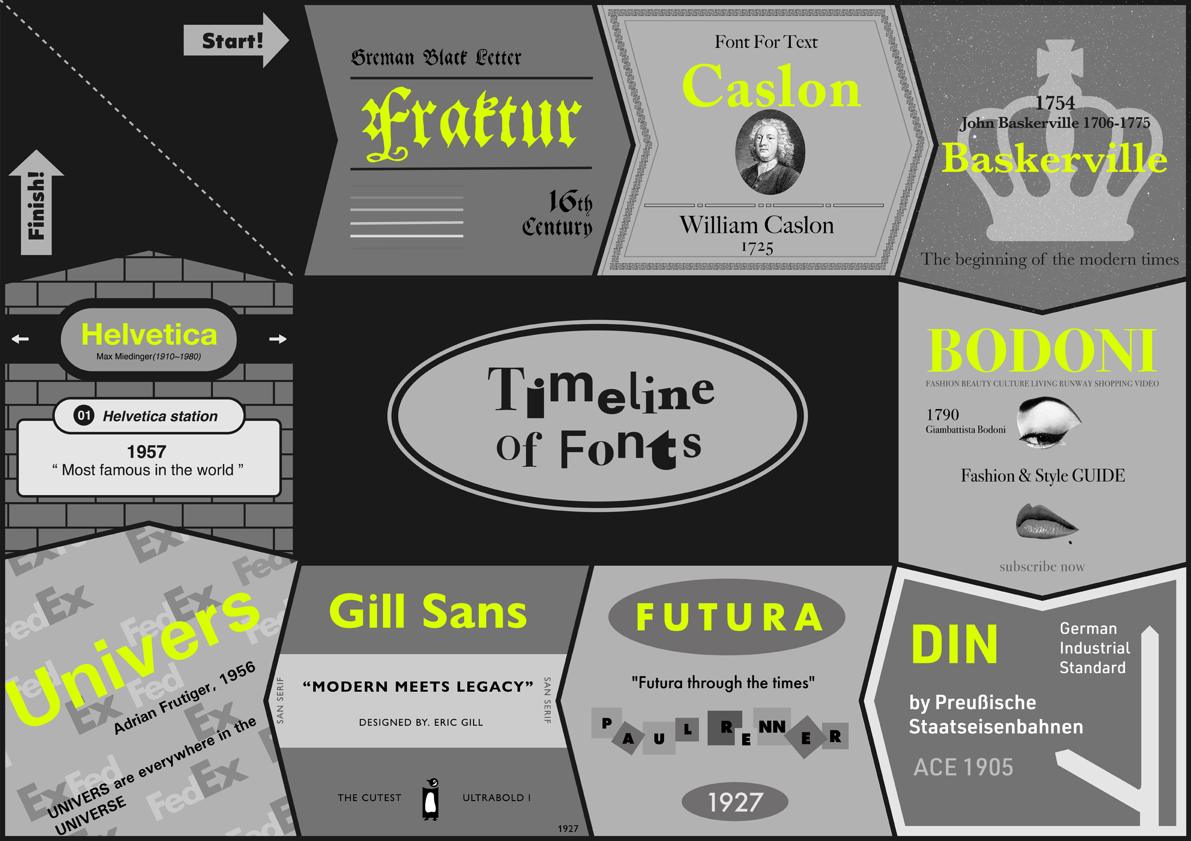 이 작업은 결과물보다는 과정에 의미를 둔다. 우리는 각자 2주 동안 조사하고 공부한 폰트를 하나씩 담당해 정보 디자인을 했다. 그리고 9개의 디자인이 모였을 때 각 폰트의 개성이 보이면서도 하나의 디자인처럼 조화롭게 보이는 것을 목표로 했다. ‘시간 여행 보드게임’을 테마로 삼아 폰트마다 한 칸씩을 배정했으며 그 폰트의 특징과 쓰임을 패러디해 각 칸을 디자인했다. 예를 들면 길 산스는 펭귄 북스의 책 표지를, 헬베티카는 지하철역 표지판을 패러디했다.