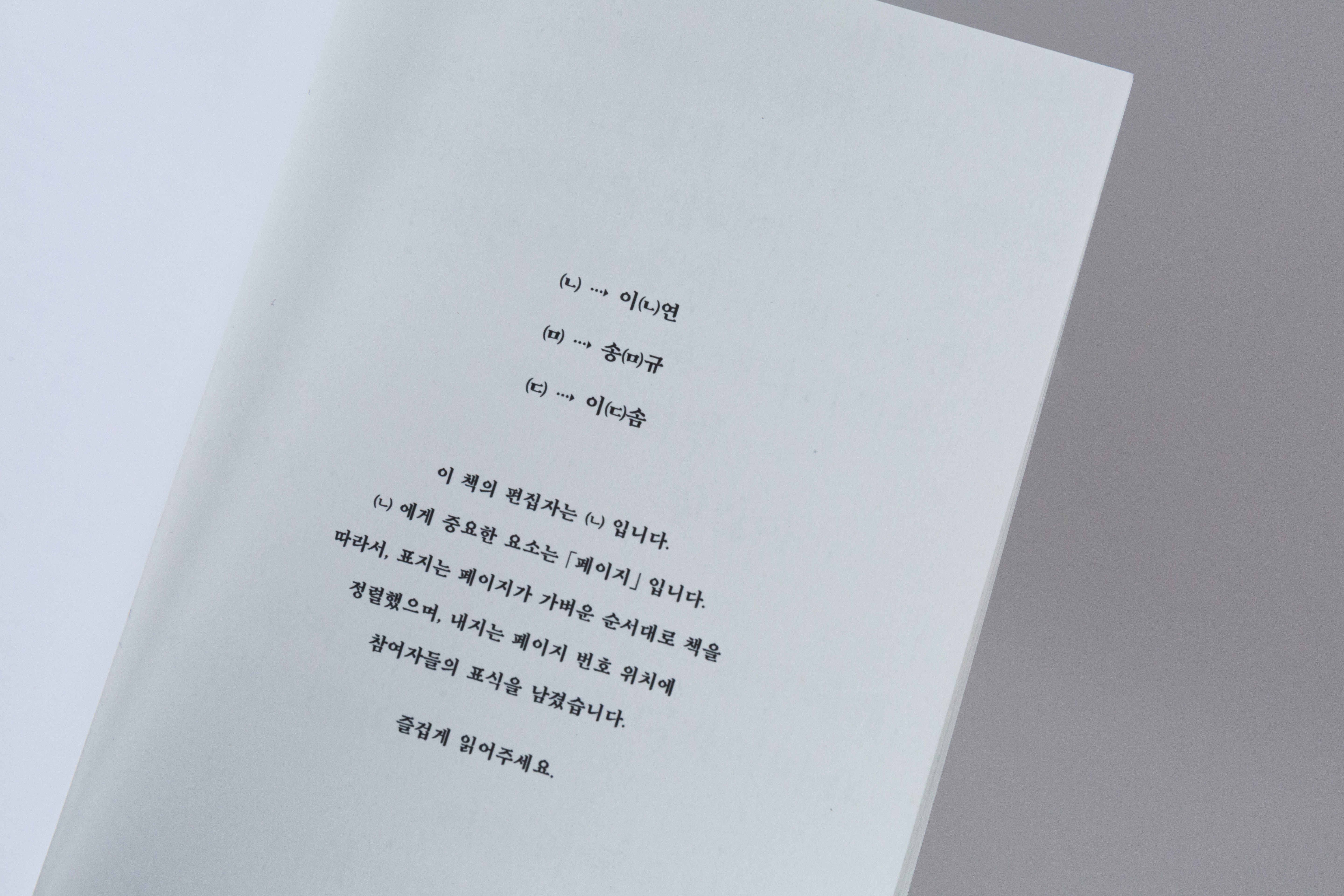 이다솜, 송명규, 이나연은 각자의 집에 있는 책장에서 글자를 찾고-보고-수집하였다. 책이 만들어지는 과정에는 많은 이들이 거쳐 간다. 글쓴이, 편집자, 디자이너 … 등 다양한 이들을 거쳐 간 글자와 문장들은 독자들이 수집하고 그들의 책장으로 이동하게 된다. 우리는 책장에 있는 책을 수집하고 ‘읽는’다는 것을 다르게 바라보고 그 안에 있는 글자들을 수집하게 되었다.