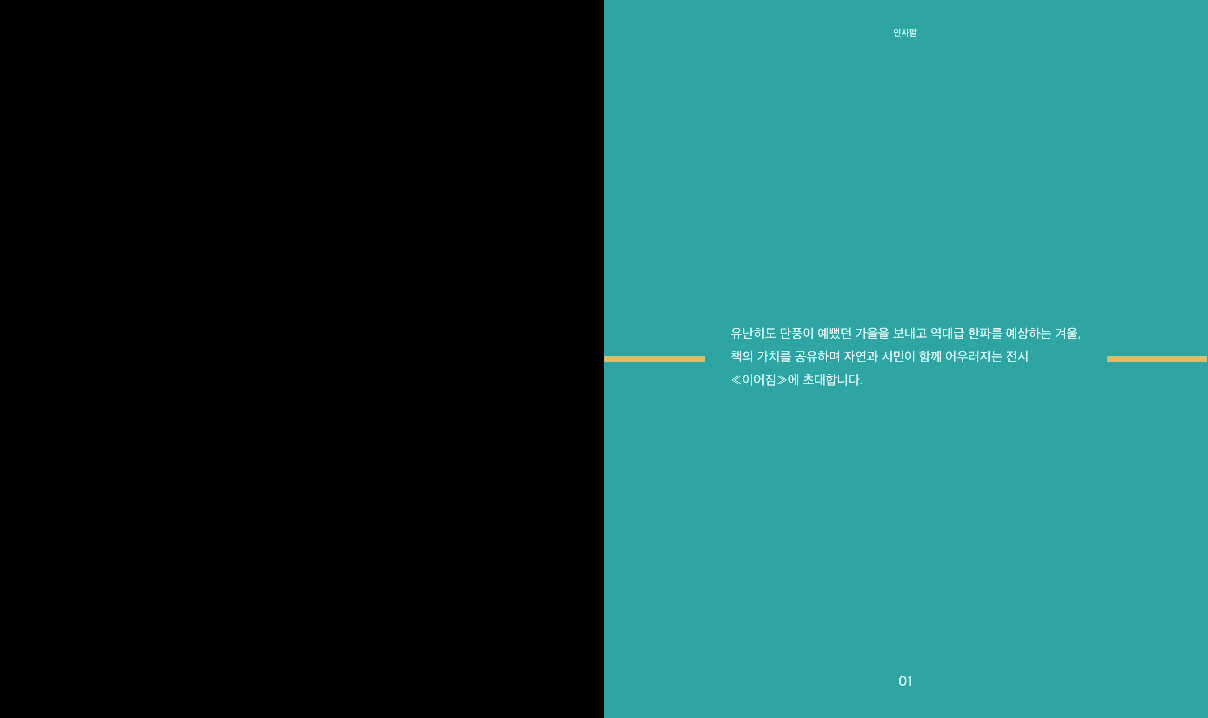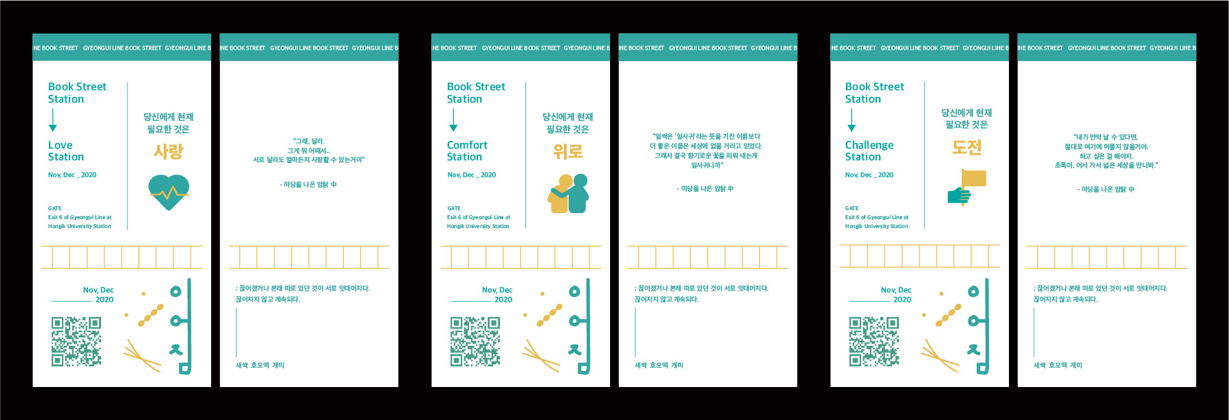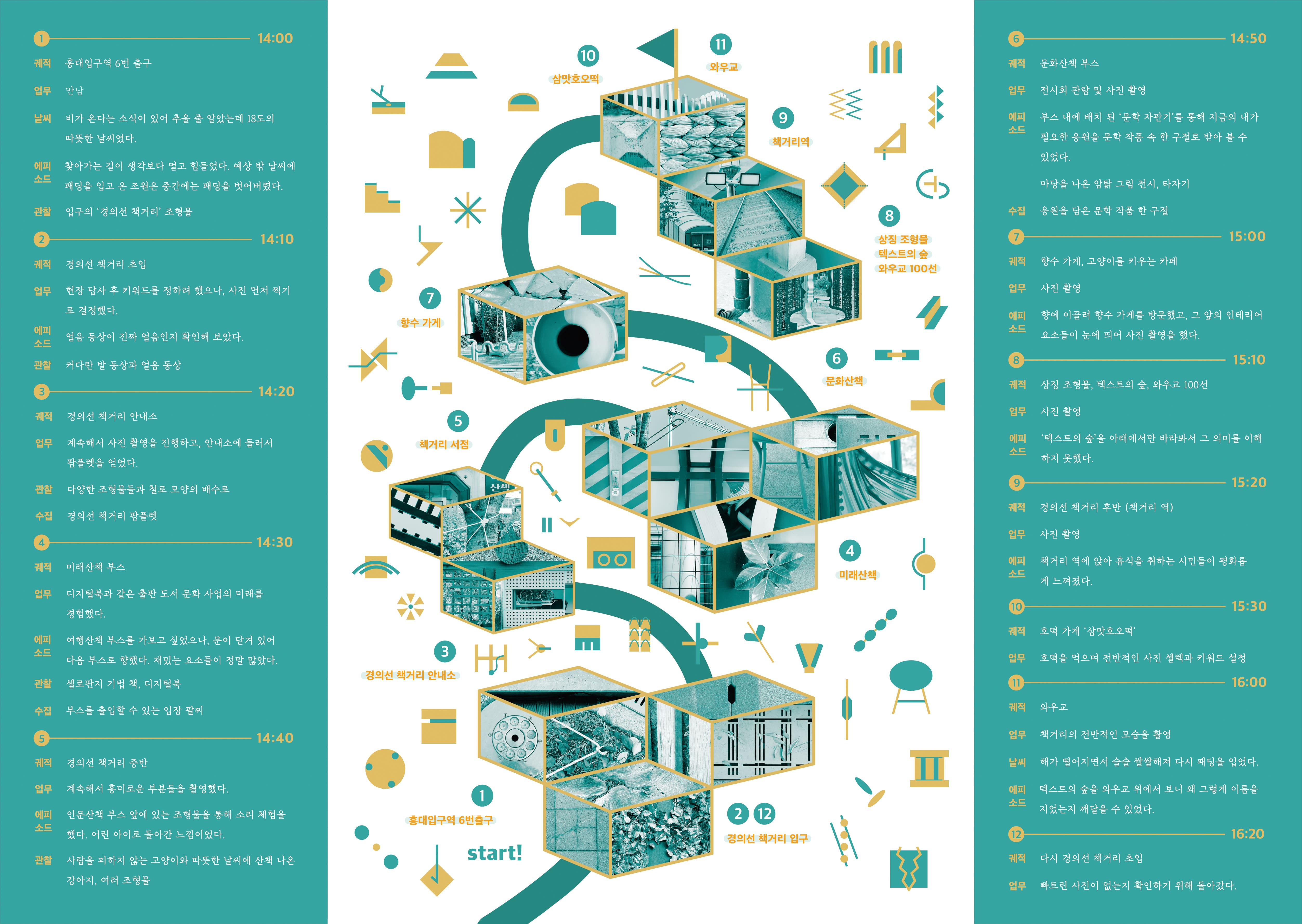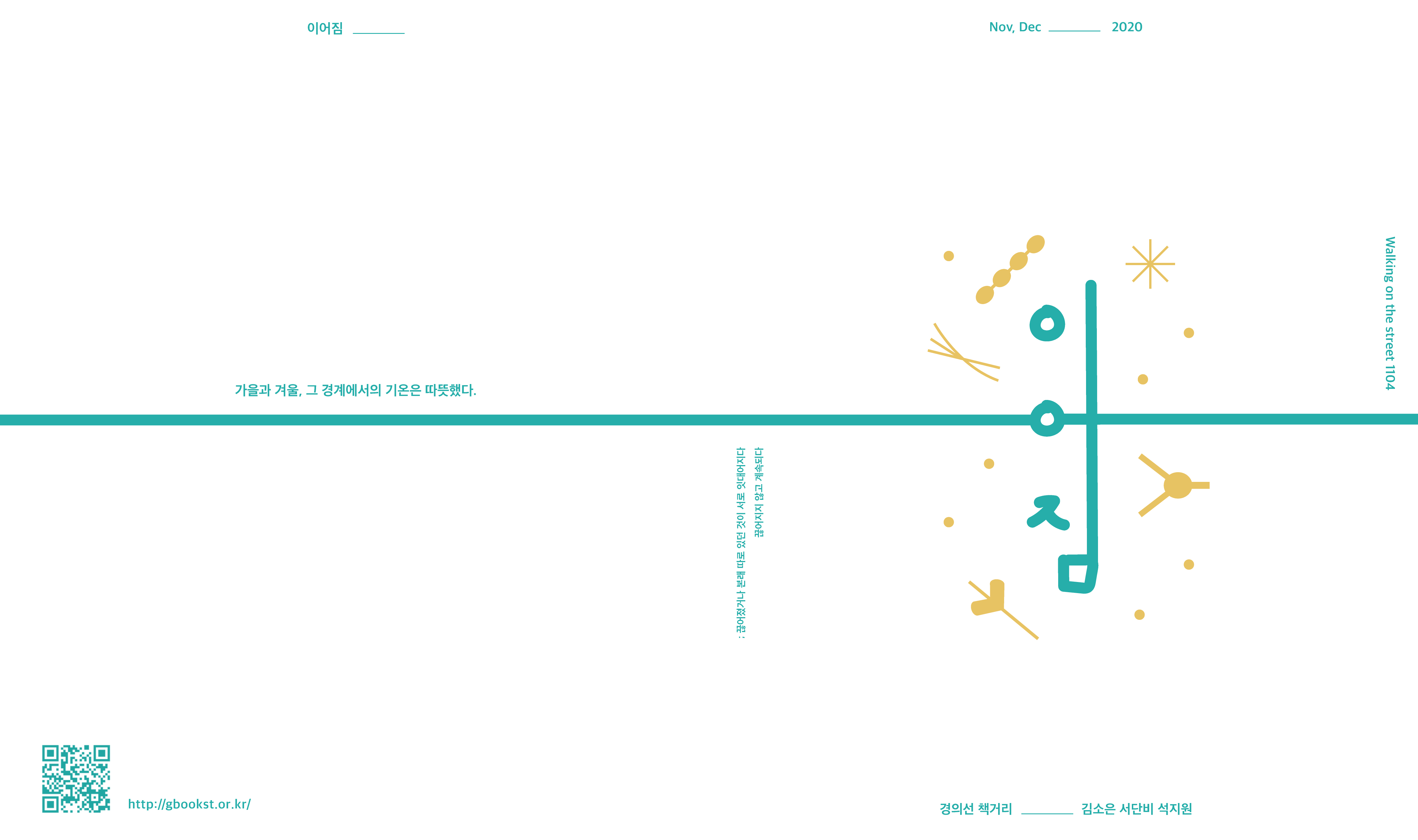 이 프로젝트의 선정 공간은 <경의선 책거리>이다. 우리는 경의선 책거리를 “책의 가치를 공유하며 자연과 시민이 함께 어우러지는 공간”으로 재해석하였고, 이 공간을 하나의 전시회로 바라보았다. 하나의 길로 이어진 산책로에서 자연과 인공, 우리와 문학과 같은 다양한 이어짐을 발견하여 <이어짐>이라는 제목을 짓게 되었으며, 전시회라는 컨셉에 맞추어 도록, 티켓 등을 제작하였다.