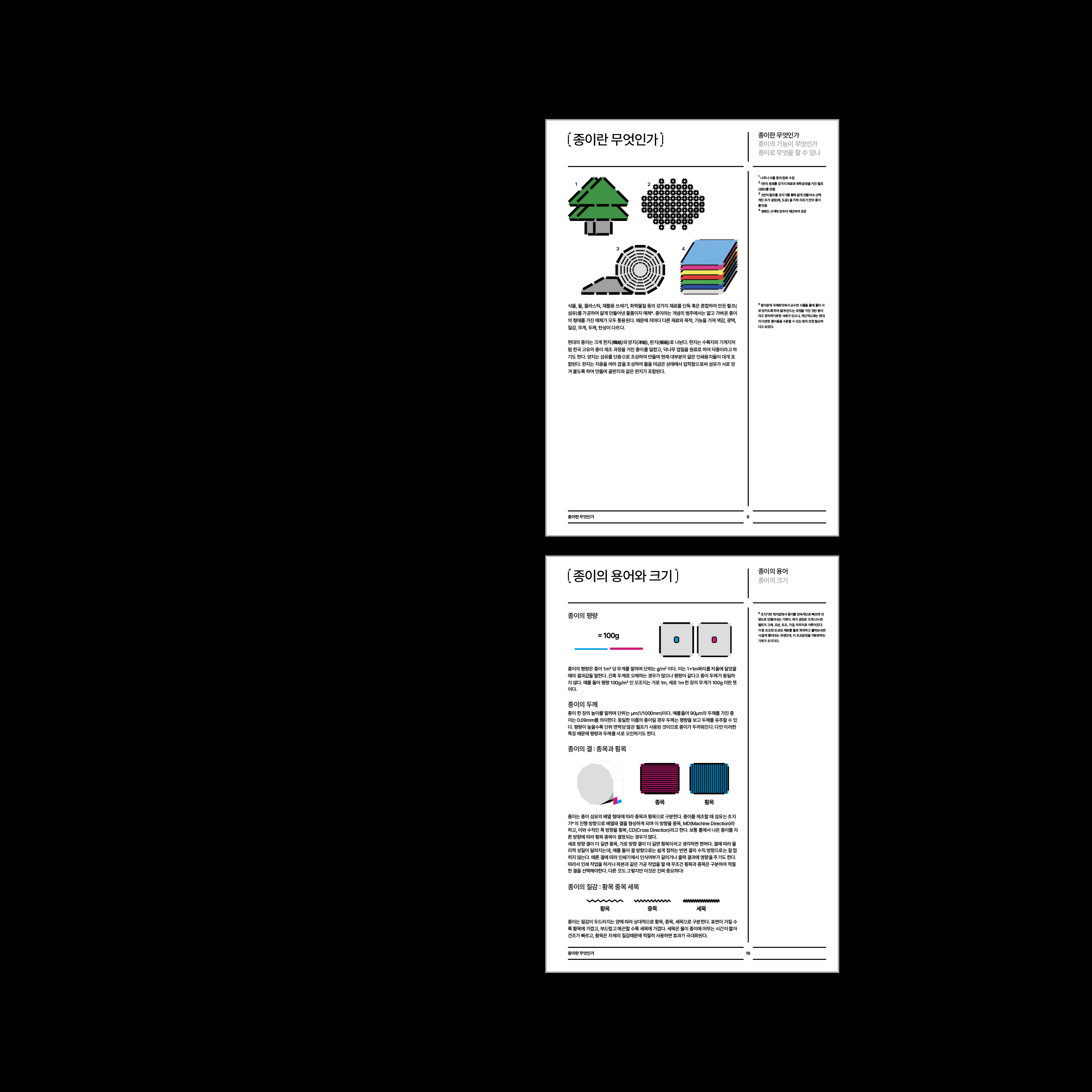 줄여서 [p:pxp!]는 디자이너와 같이 종이와 밀접한 관계에 있는 종사자들을 위한 종이 견본 프로젝트입니다. 종이가 현대 사회에서 가지는 의의를 점검하는 것에서부터- 역사, 정의, 구조 등의 정보를 수록했습니다.