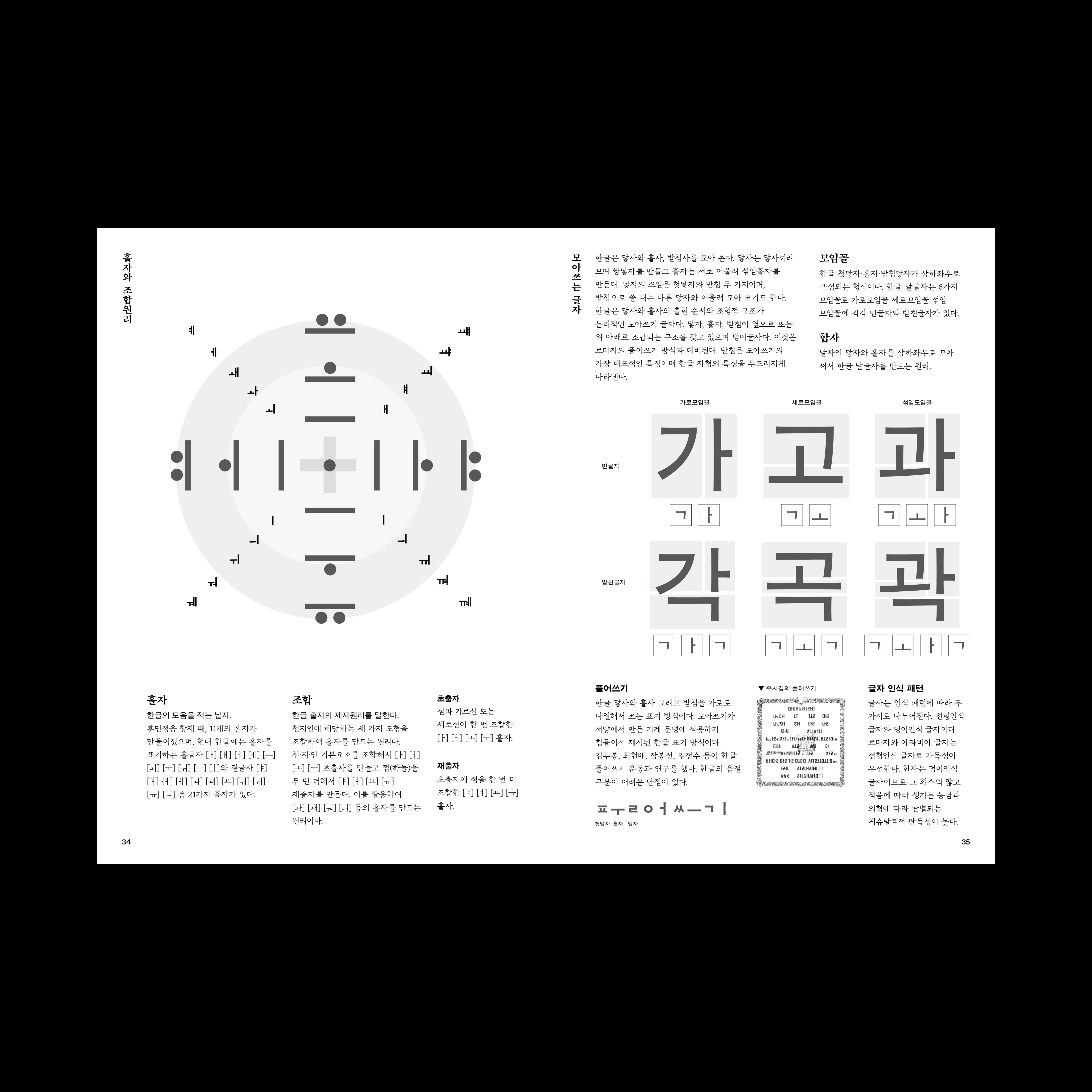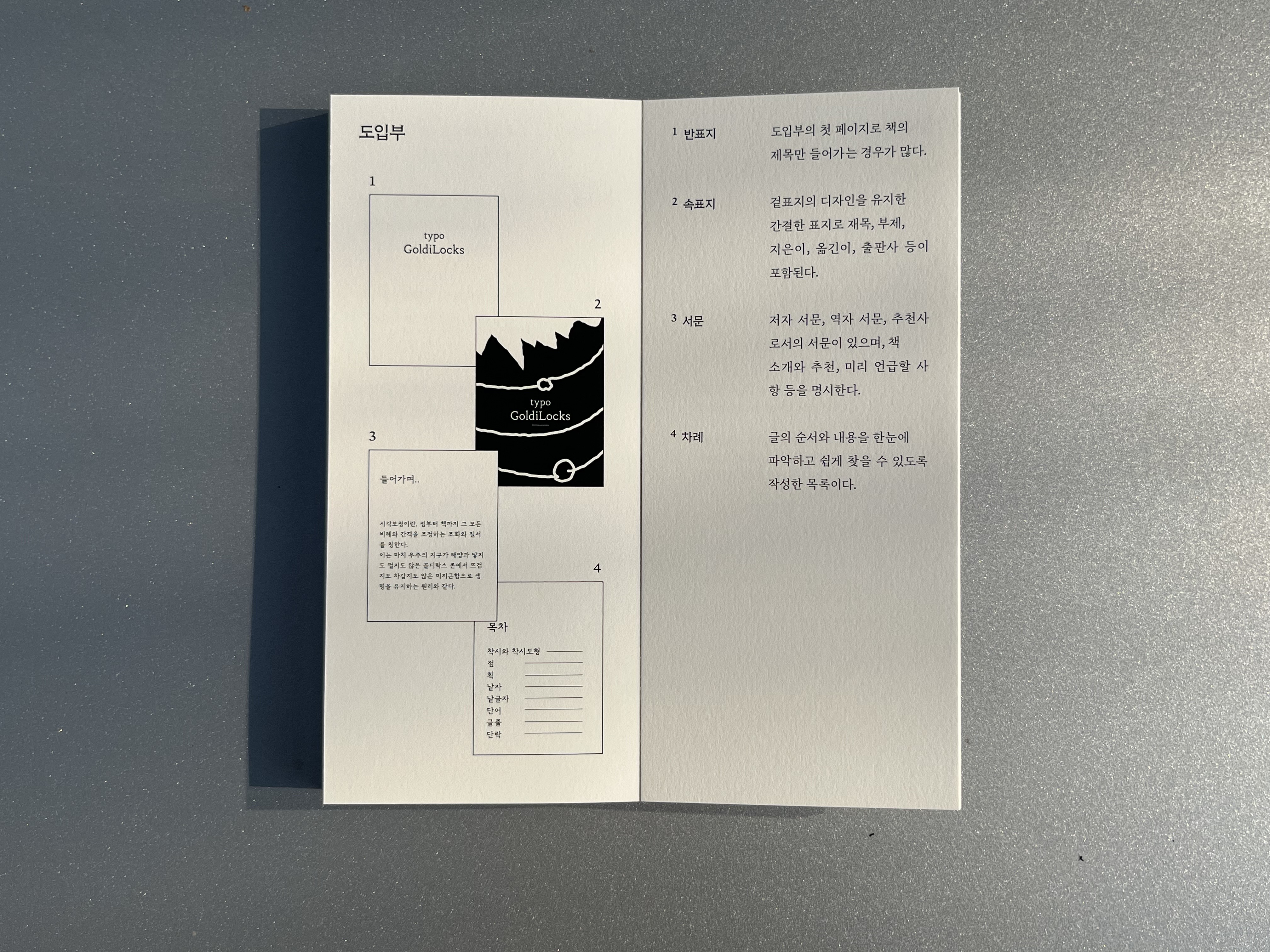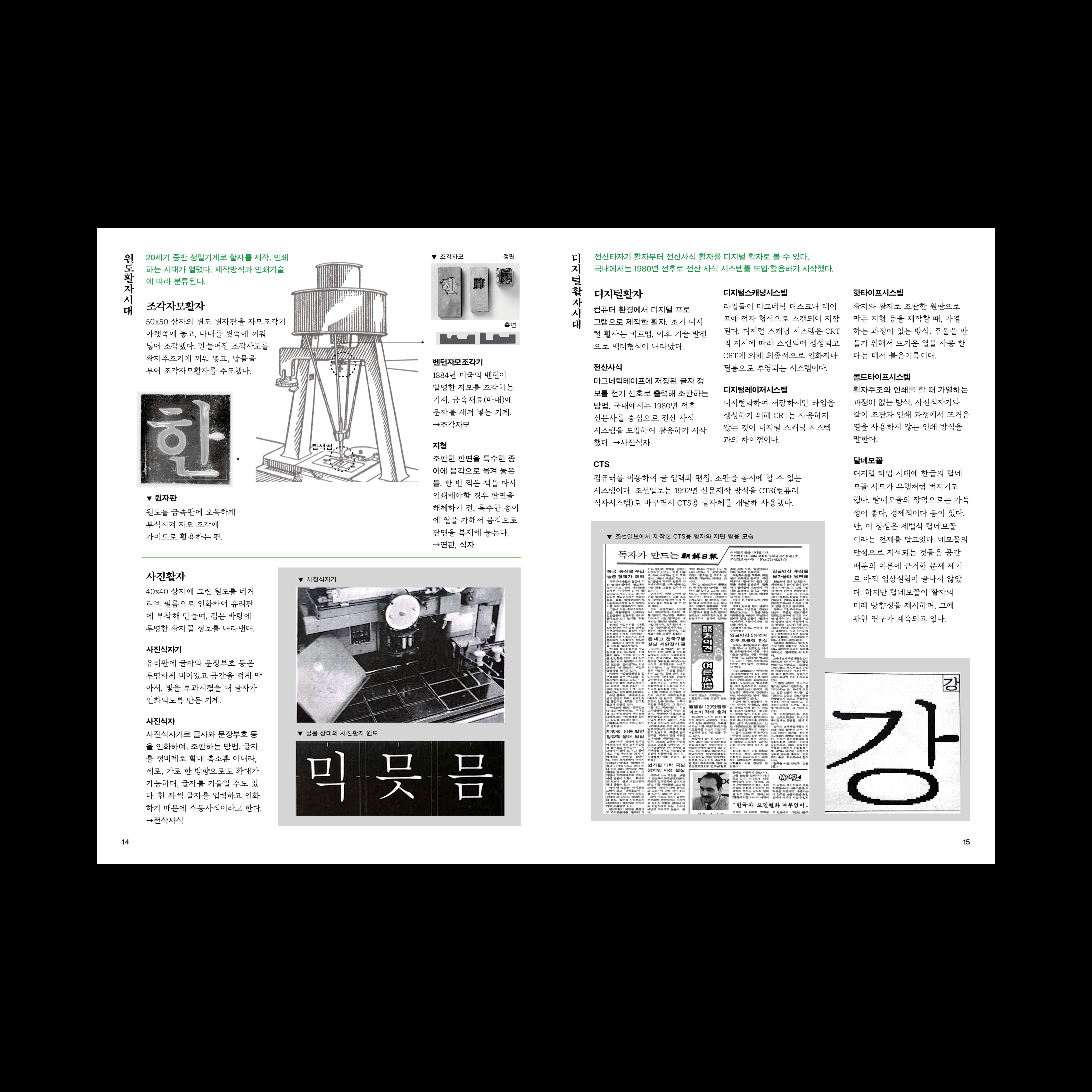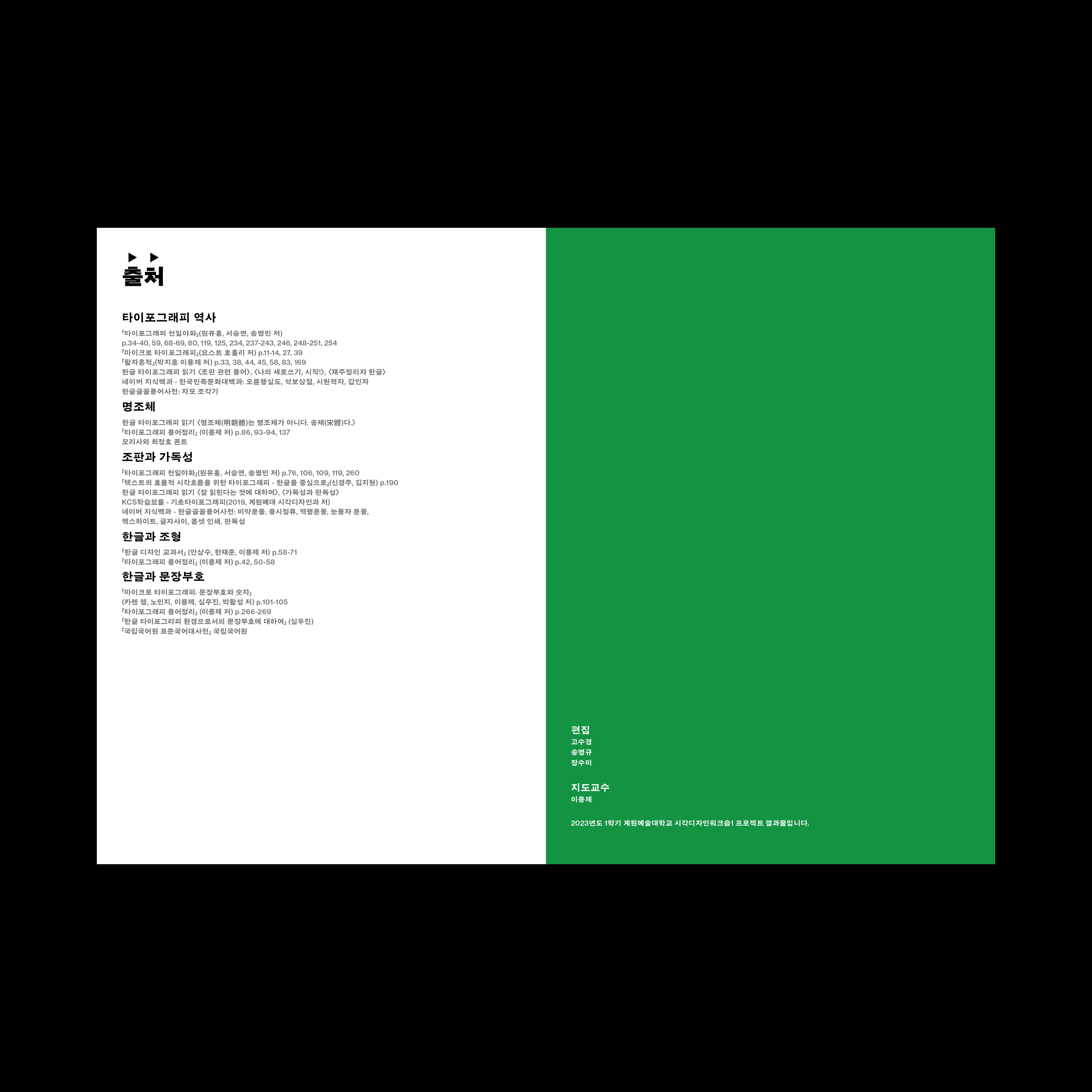 타이포그래피 역사, 명조체, 조판과 가독성, 한글과 조형, 한글과 문장부호에 대한 내용과 이미지를 정리하여 중철 제본의 책으로 엮었다.