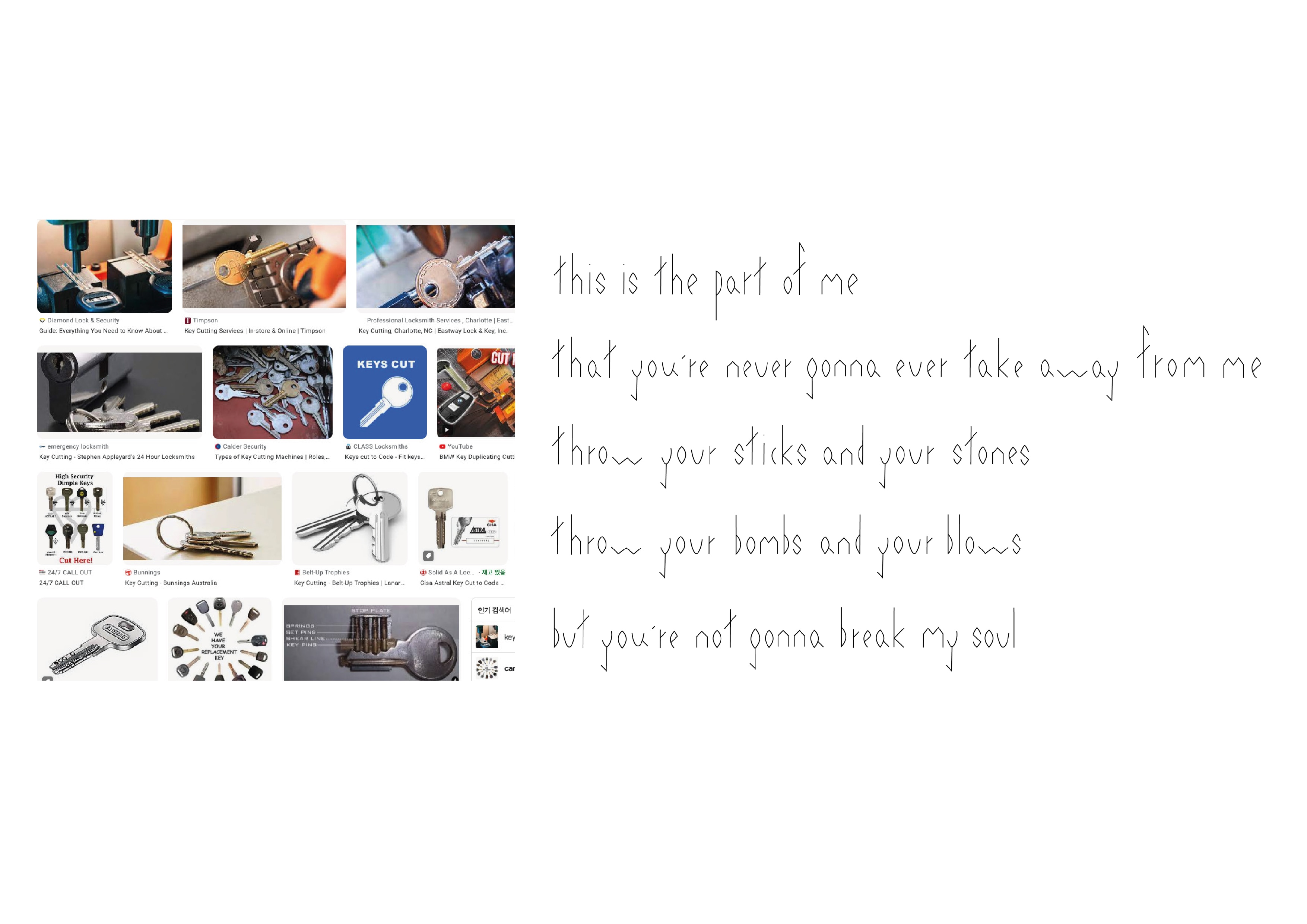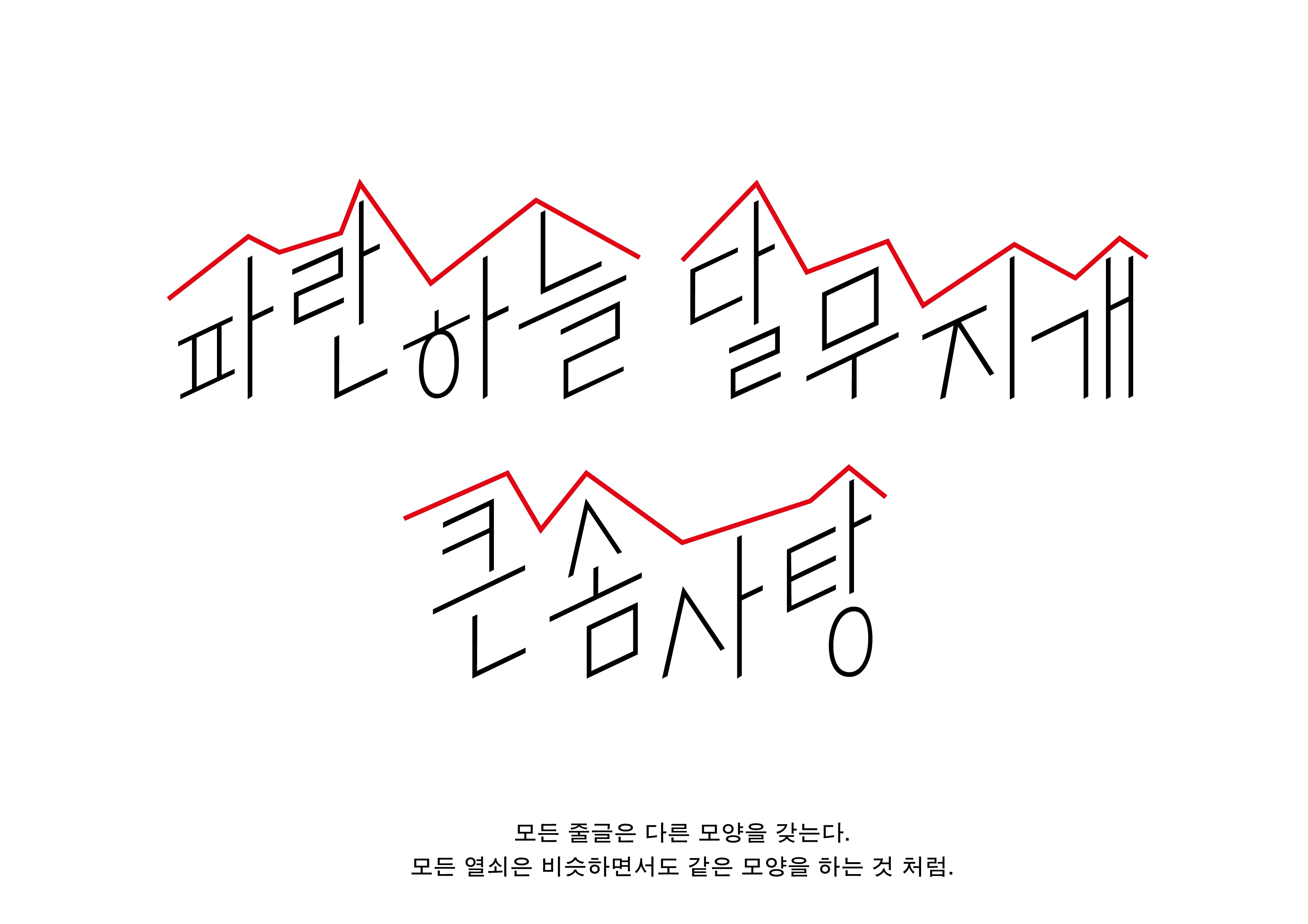 열쇠는 각기 다른 모양이지만 비슷한 구조로 되어 있습니다. 자세히 바라보면 열쇠의 구조 중 이빨 부분은 높낮이가 다른 모습을 볼 수 있습니다. 열쇠의 이빨이 하나의 문장처럼 보이기도 하고 줄글처럼 보이기도 했습니다. 이미지메이킹 수업에서 찾은 라틴 서체 '열쇠체'와 함께 할 수 있는 한글 서체를 그려봤습니다.