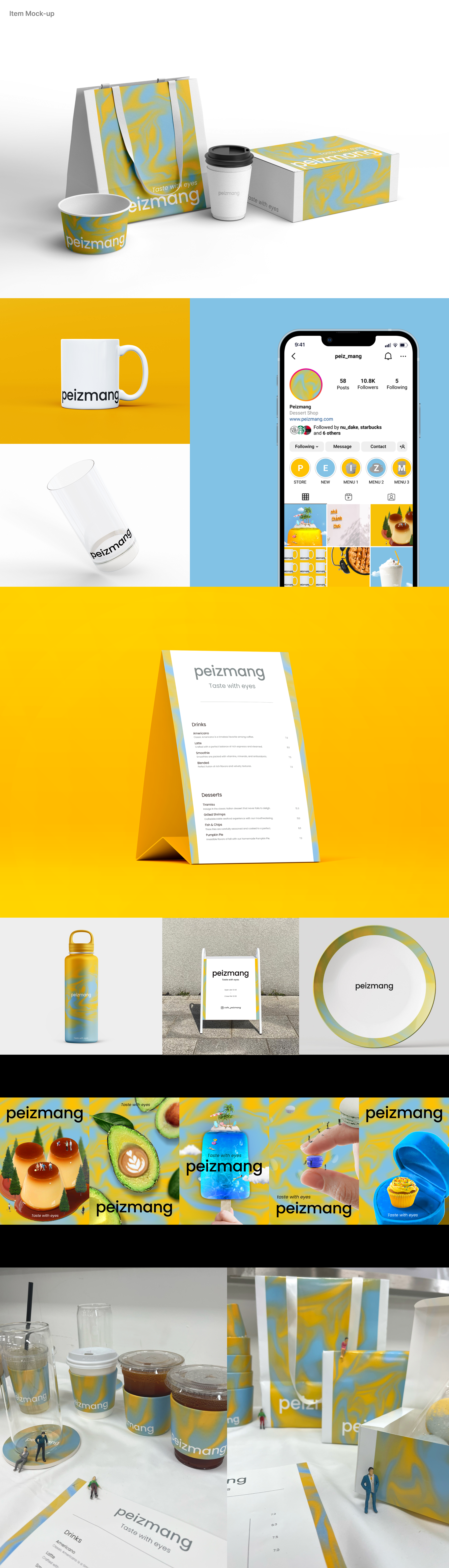 초현실주의 카페라는 컨셉으로, 기존과 다른 비현실적인 시각을 통해 새로운 감각과 체험을 제공하는 카페를 브랜딩하였다. 시각적으로 충격을 주는 기법 중 하나인 *데페이즈망 기법을 팀 내의 핵심 표현 기법으로 선정하고 디자인 작업을 진행하였다.