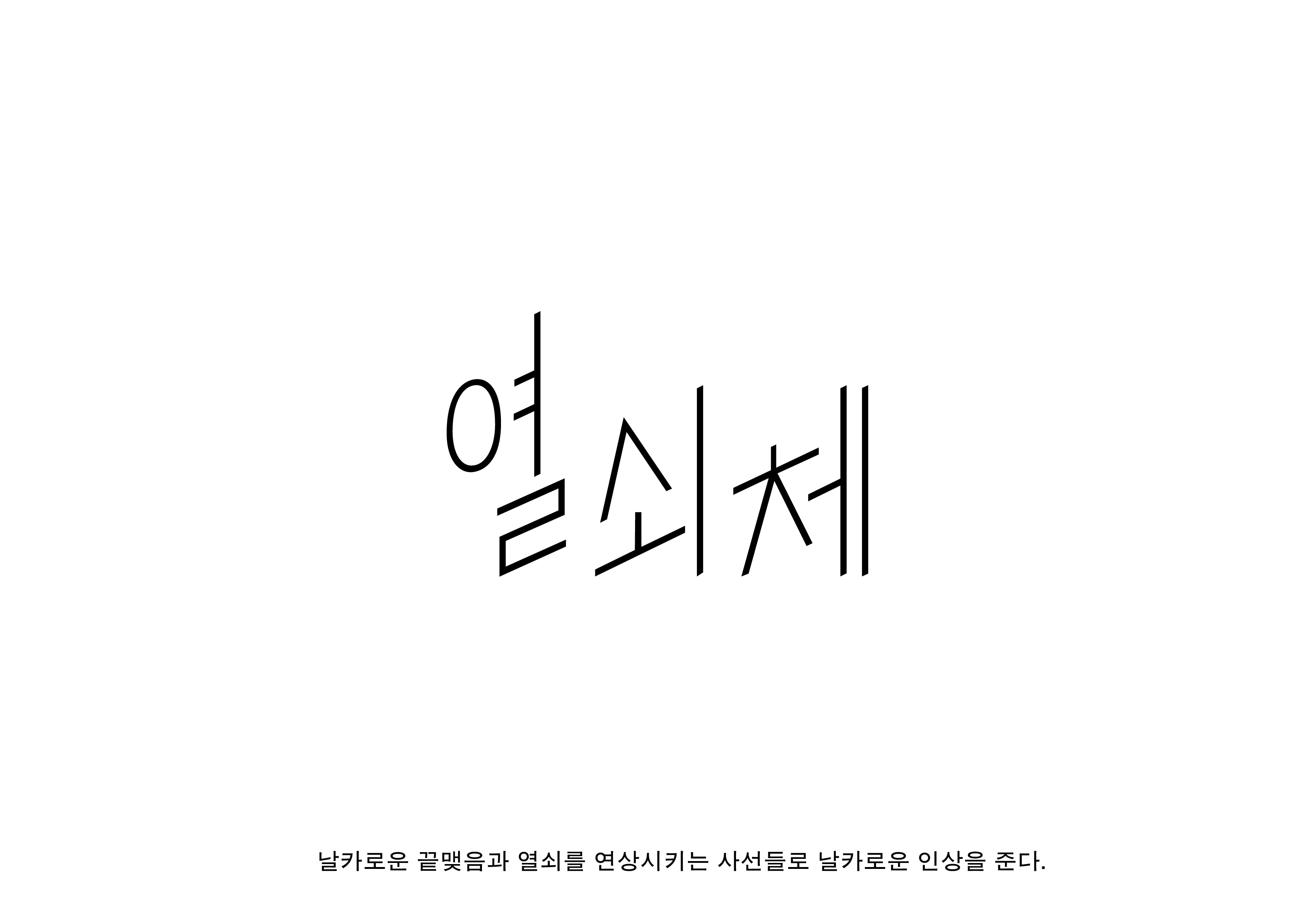 열쇠체는 제목용 서체로 민부리 계열의 탈네모꼴 형태로 그렸습니다. 하나의 문장 혹은 줄글이 하나의 열쇠처럼 굴곡지게 보이기 위해서는 탈네모틀의 형태를 사용하는 것이 효과적이라 생각했습니다. 날카롭고 단단한 느낌을 받으며, 사선으로 그려지는 획의 모양을 한글에서도 살리며 글자를 그렸습니다.