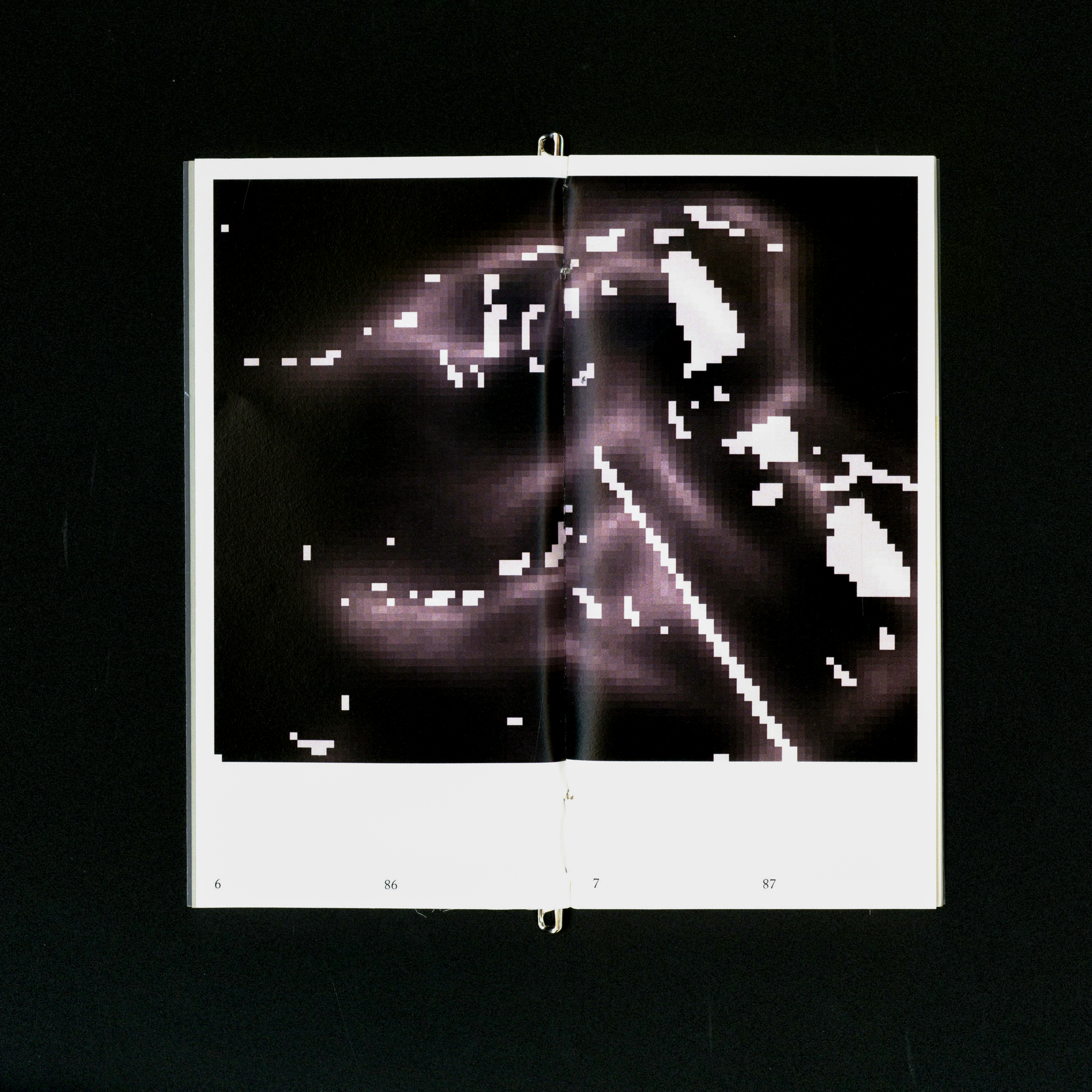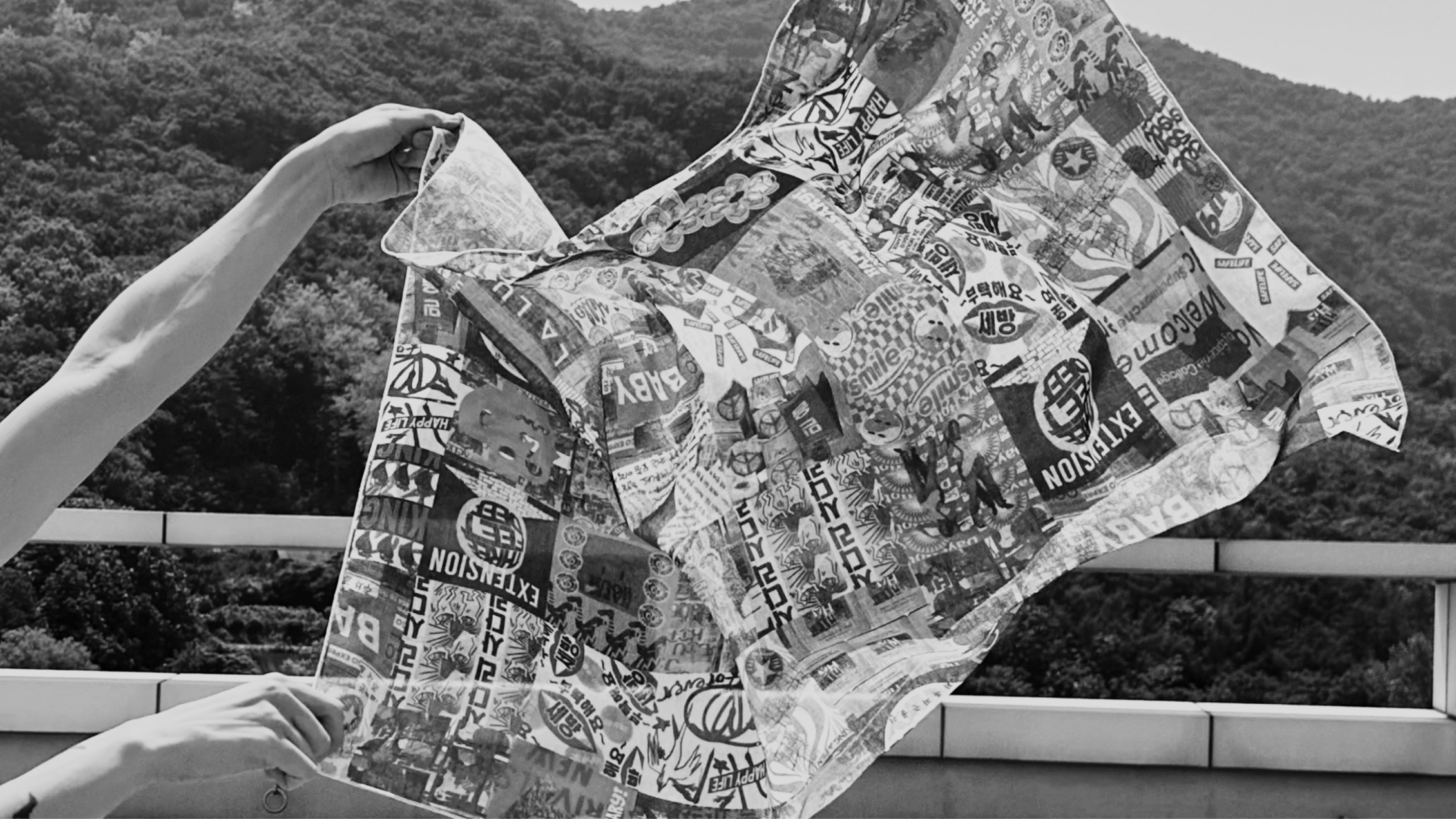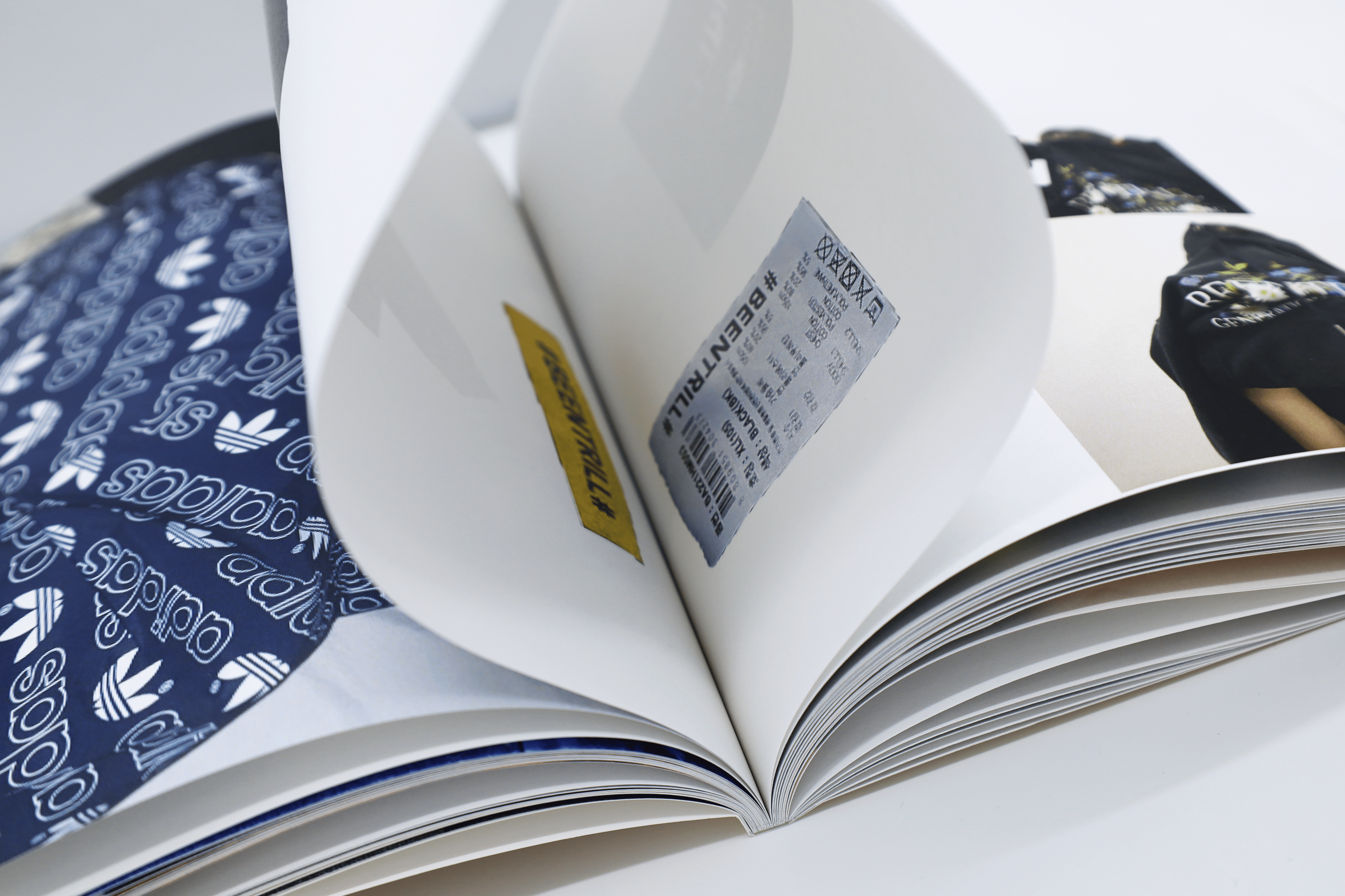 3권 - 벗어던지는 순간, 옷의 경계는 흐려지기 시작한다. 무작위로 한데 엉킨 부분과 전체는 옷과 옷감의 경계를 모호하게 만든다. 레터링은 완전히 뒤섞이고 뒤집히며 그 형체를 알아볼 수 없게 된다. 그 모든 비춤과 숨김들은 공중에서의 운동량에 따른 우연에 기인한다. 이를 수집할 매체로는 플래시 카메라를 사용한다.