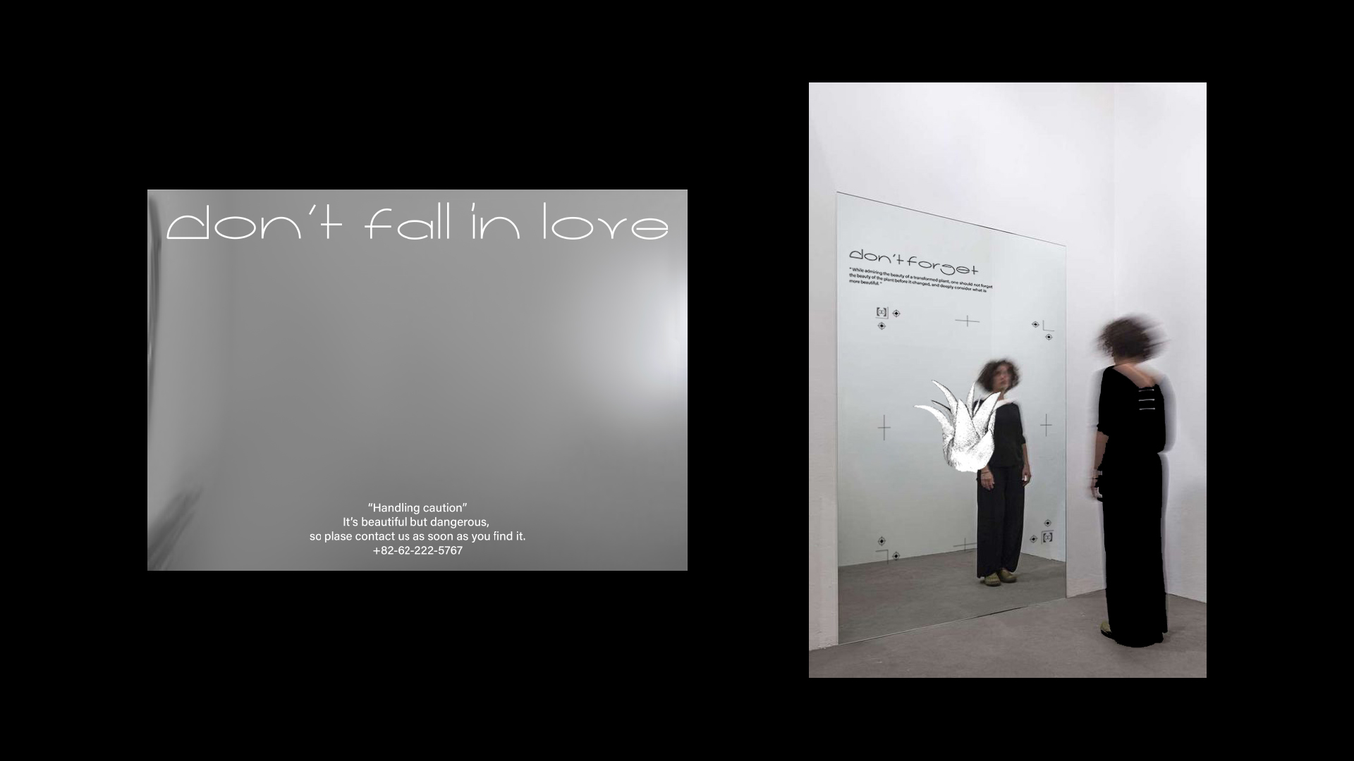 내 양면성과 그 모순을 주제로 하기에 나는 이곳에서 영어로 말한다. 그리고 내가 사랑하지만 상반되는 두 컬러로 양면성을 직관적으로 보여주며 각 컬러에 해당하는 내 이야기 속 상반되는 개념들을 나열한 목소리가 흘러나오도록 하였다.