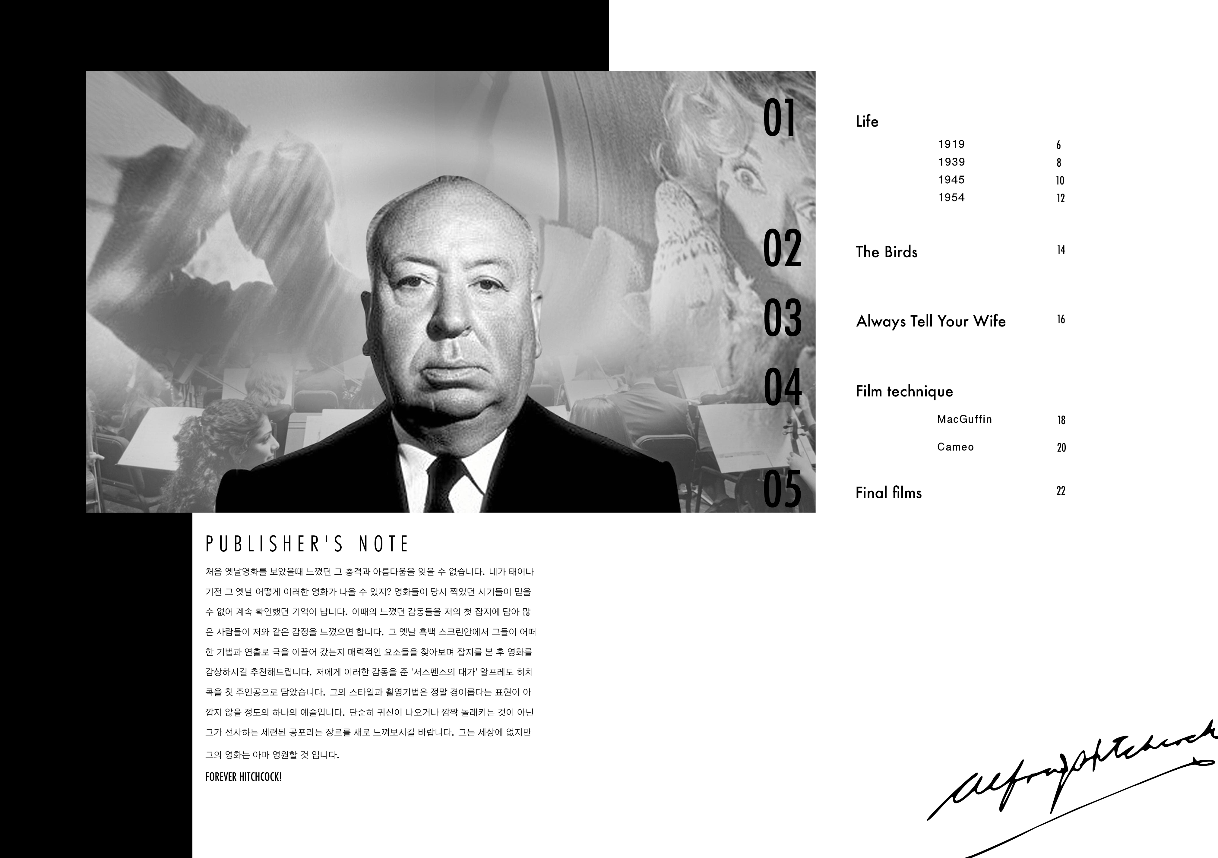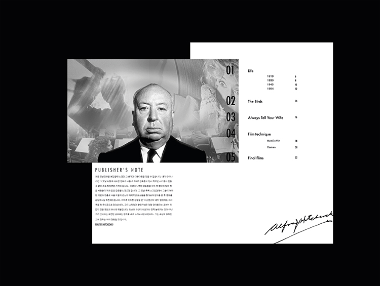흑백 필름 매거진 heuk 영화를 다루는 잡지 시장은 현저히 작아졌으며, 현재까지 발행돼도 상영 작품 위주의 상업성이 강하다. 디지털 세상에 이러한 잡지를 굳이 돈을 주며 사는 사람이 있을까 싶다. 그리하여 소장 가치가 있는 영화 잡지를 만들고 싶었다. 그중에서 우리가 접하지 못했던 태어나기 전 세상에 나왔던 수많은 흑백영화를 많은 이들에게 소개하고 싶었다. 필름 디렉터(인물) 중심으로 이루어지는 그들의 멋진 필모그래피 아카이빙 북 컨셉의 잡지를 만들고 싶었다. 첫 호의 주인공은 내가 가장 사랑하는 알프레드 히치콕 이다. 박유라 @worstdayeverr