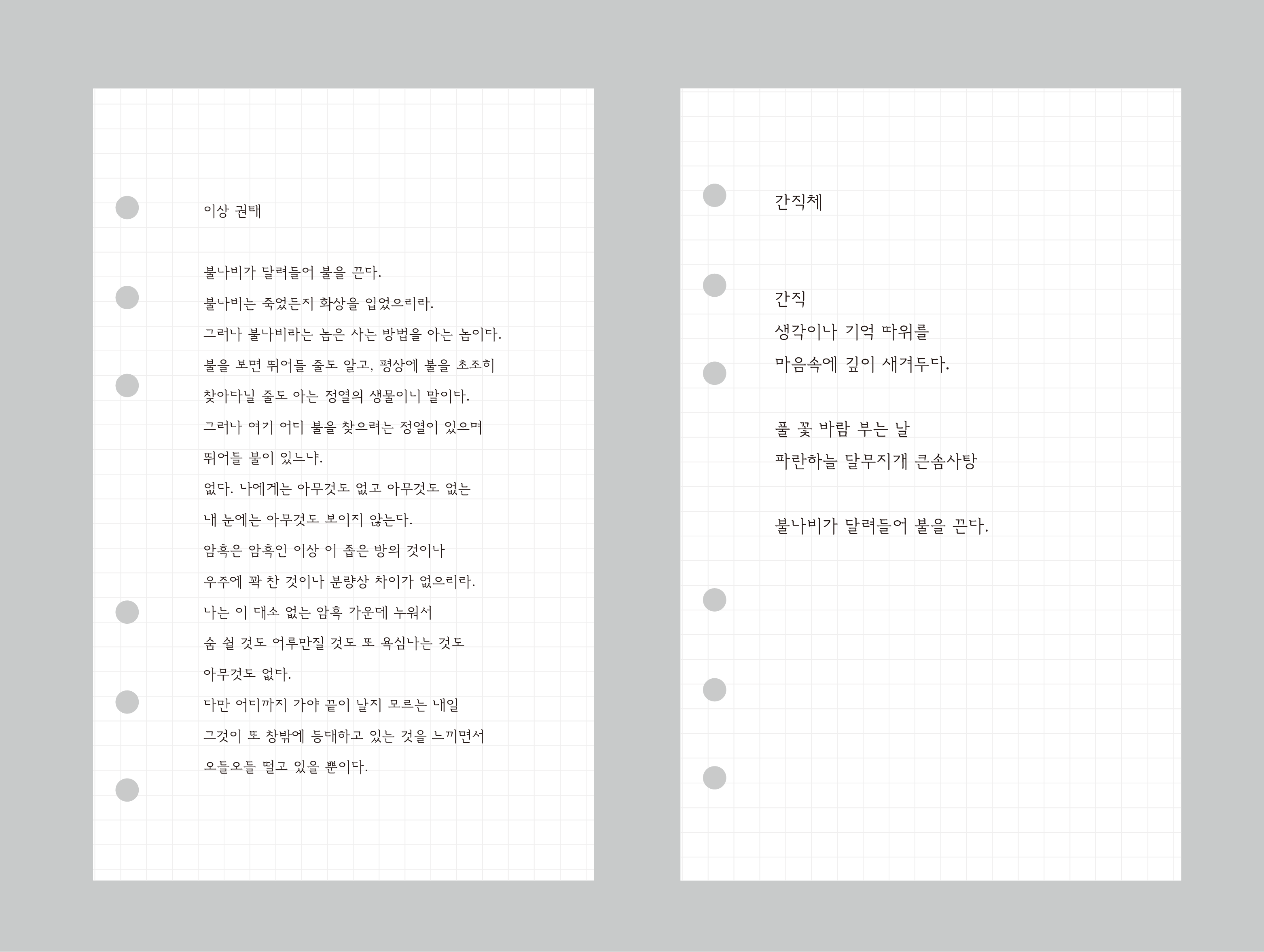 부드럽고 담백한 인상을 지닌 아날로그 타자기 서체에서 영감을 얻어, 정석적인 출판물 같지 않고 친근한 인상을 띌 수 있도록 디자인했다.