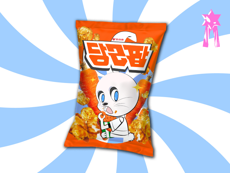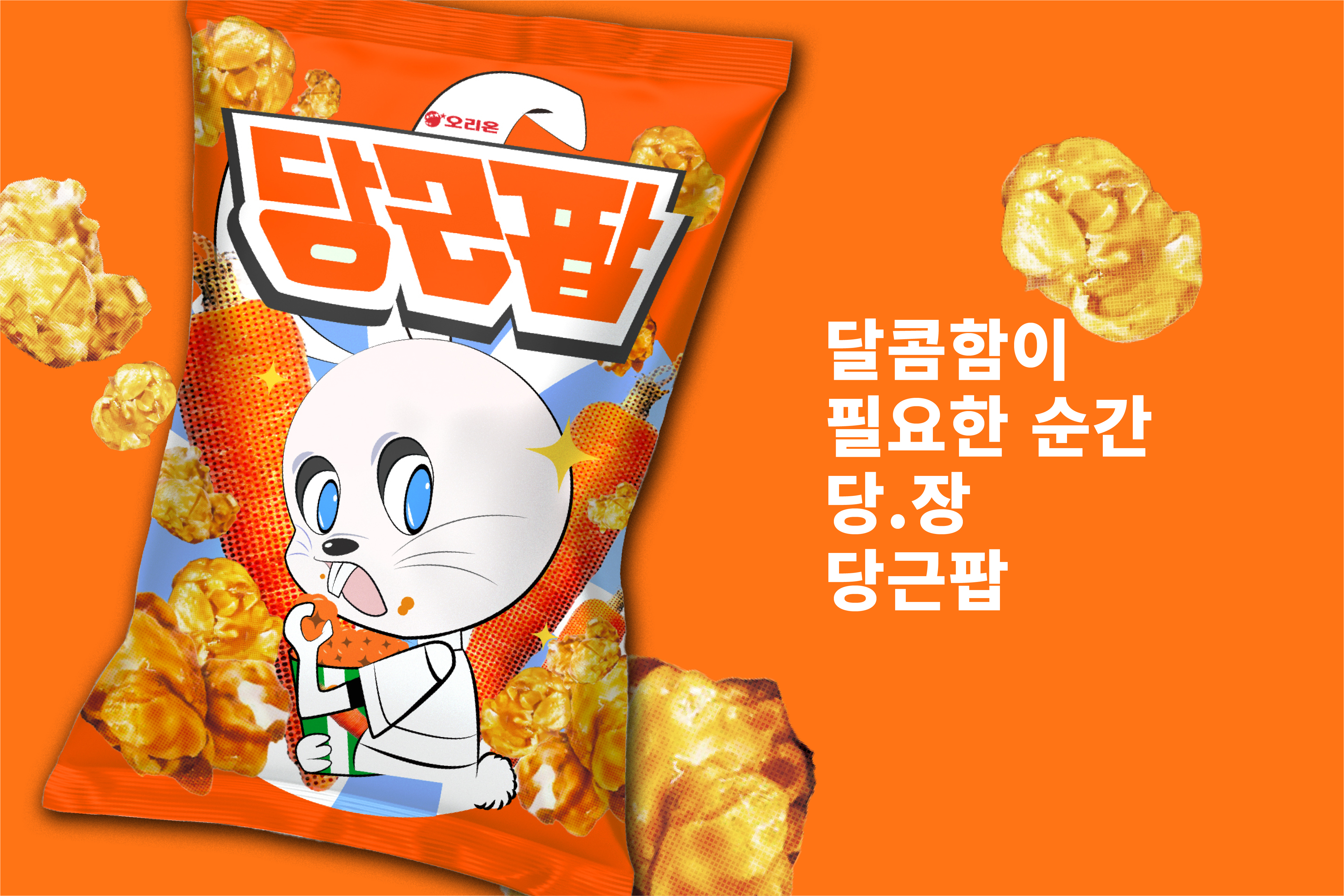 달콤 아삭한 당근과 팝콘의 콜라보 2023 계묘년을 맞이하여 토끼에 관련된 팝콘을 만들고 싶었다. 디자인은 그래픽과 실사 이미지를 함께 사용해 귀여움과 깔끔함을 동시에 지니게 하였다. 메인 컬러로는 채도가 높은 주황색으로 많은 과자들 사이에서도 눈길을 가게 하였다. 김별 qufdl001004@kaywon.ac.kr