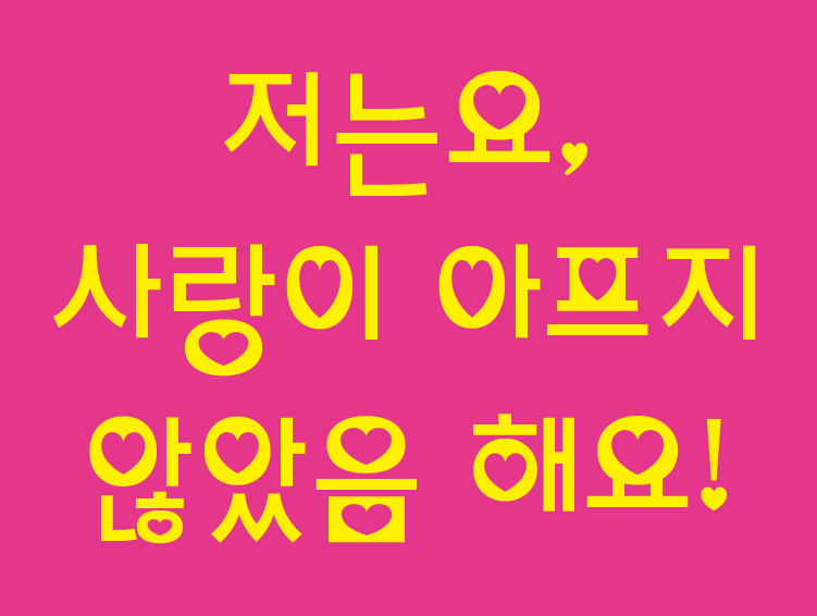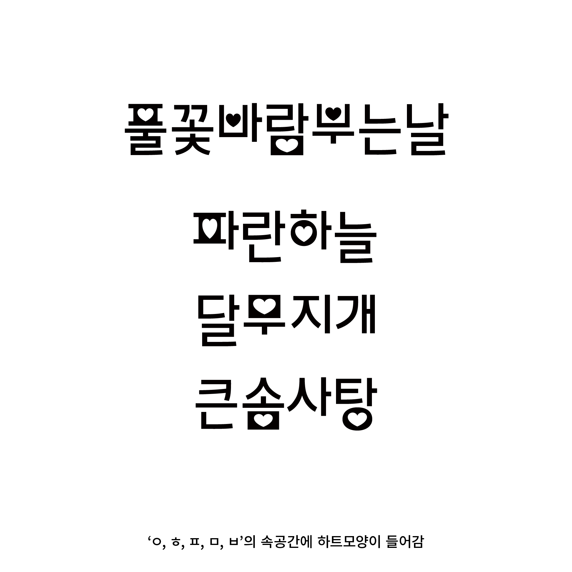 HEART TO TOE (HeartToToe-Regular.otf) 인상: 모던한, 깔끔한, 세련된, 얇은, 심플한, 직선적 구조: 탈네모꼴 쓰임: 제목 굵기: Regular 활용: 초대장, 엽서, 이벤트 타이틀, SNS 게시물 타이틀, 책 제목 등 “어디에 쓰여도 작은 포인트 하나로 무심하고 깔끔하게 포인트를 줄 수 있는” ‘왜 그림 장식 요소가 들어간 활자는 대부분 둥글고 깜찍한 인상을 가졌을까?’라는 의문으로부터 시작되었다. 기존의 장식 요소가 들어간 ‘깜찍한’ 활자에서 어리고 화려한 이미지를 덜고 한층 모던하고 깔끔하며 심플한 인상을 주는 활자를 기획했다. 획이나 글자 주변부에 장식이 들어가는 것보다는 속공간의 활용이 추구하는 인상에 적합할 것 같다. 종성의 모양이 최대한 원형을 헤치지 않도록 하..