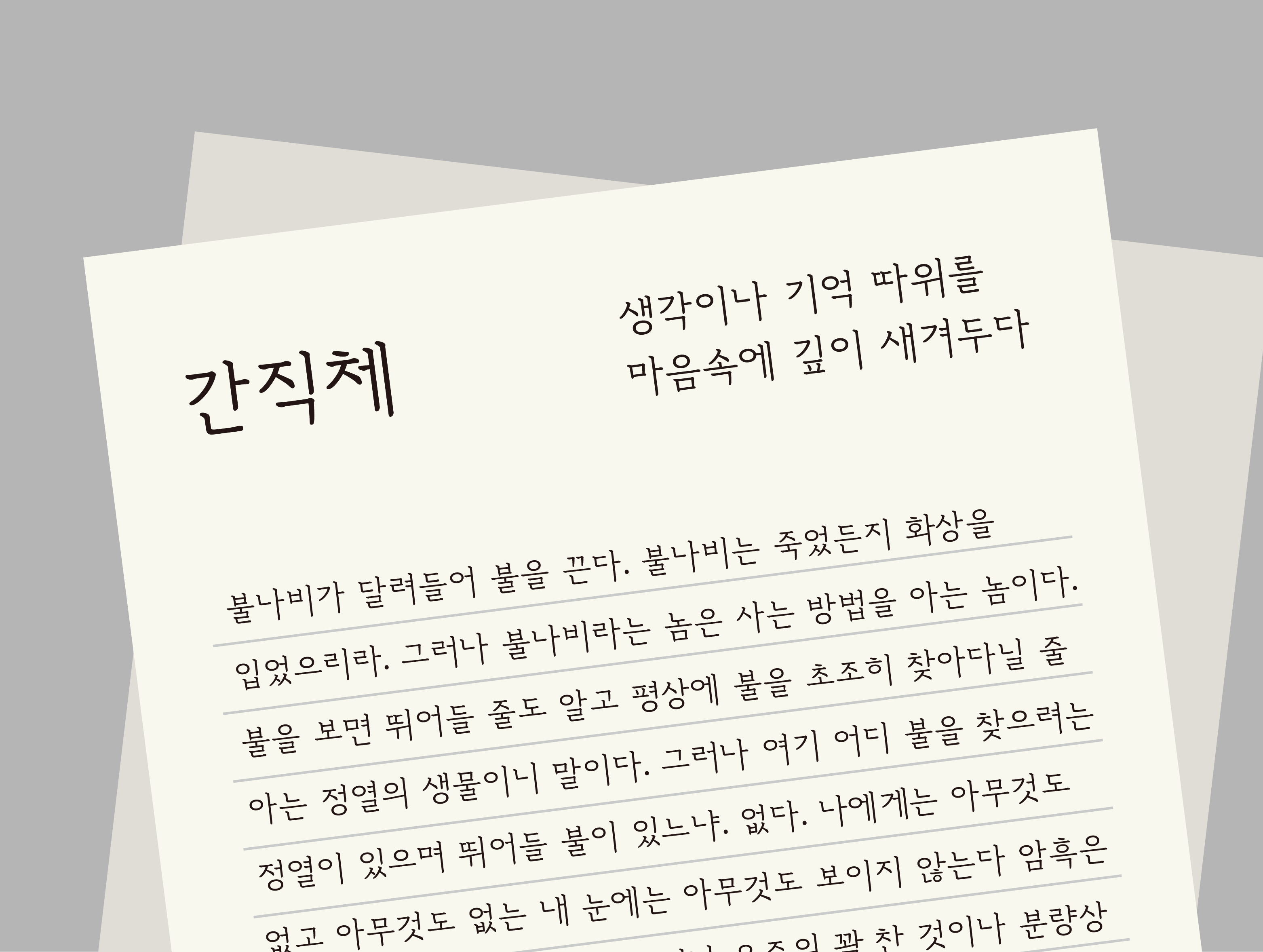 ‘생각이나 기억 따위를 마음속에 깊이 새겨두다’라는 의미의 <간직>은, 소중한 글들을 모으거나 선물할 때 사용하는 용도로 고안된 서체이다.