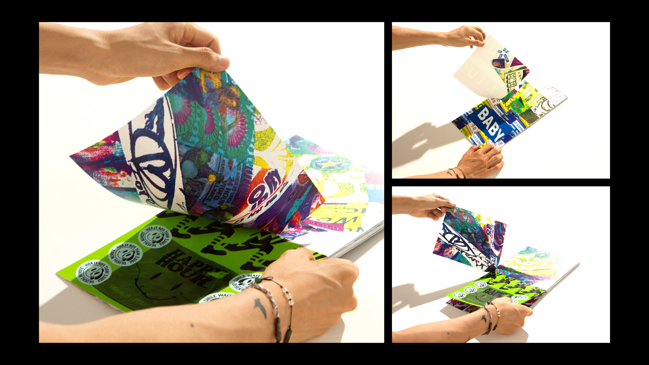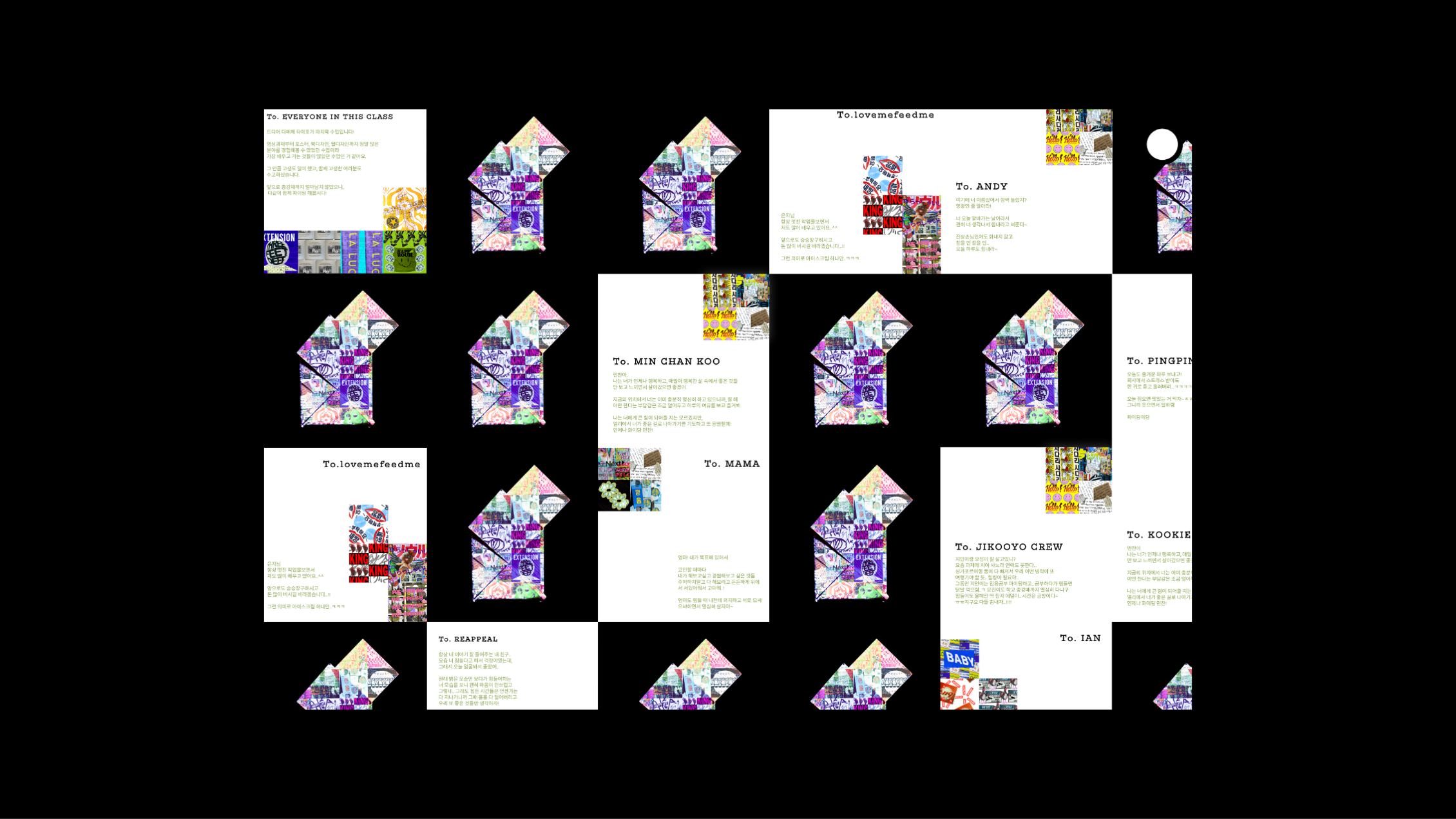 과제 진행 과정을 찍은 51장의 사진들을 포토샵으로 깨트리고 꾸며 그래픽 잡지의 느낌을 주었습니다.