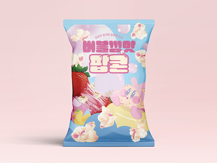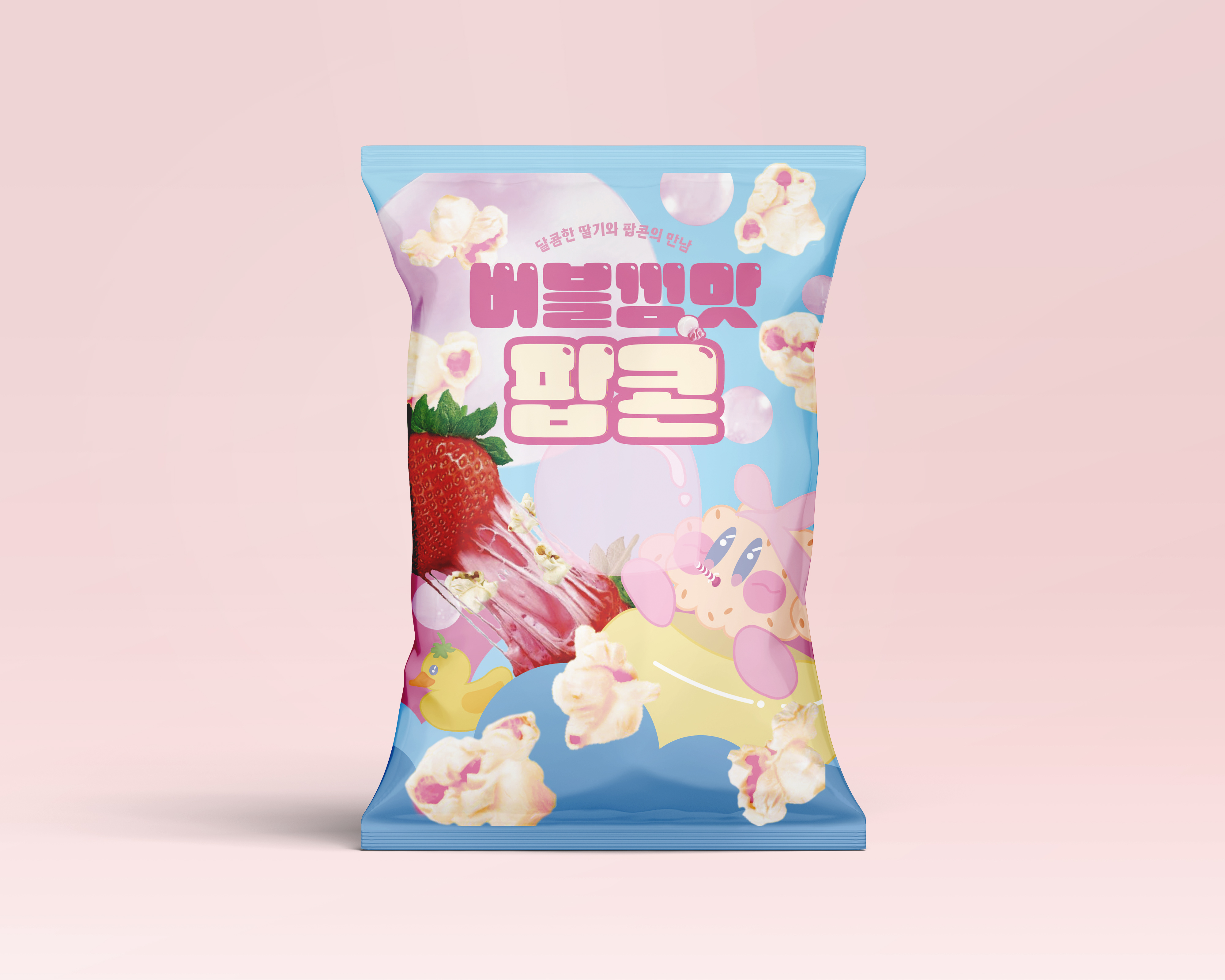버블 껌 맛 팝콘의 패키지 디자인으로 팝콘 캐릭터가 풍선껌을 부는 모습으로 표현했습니다.