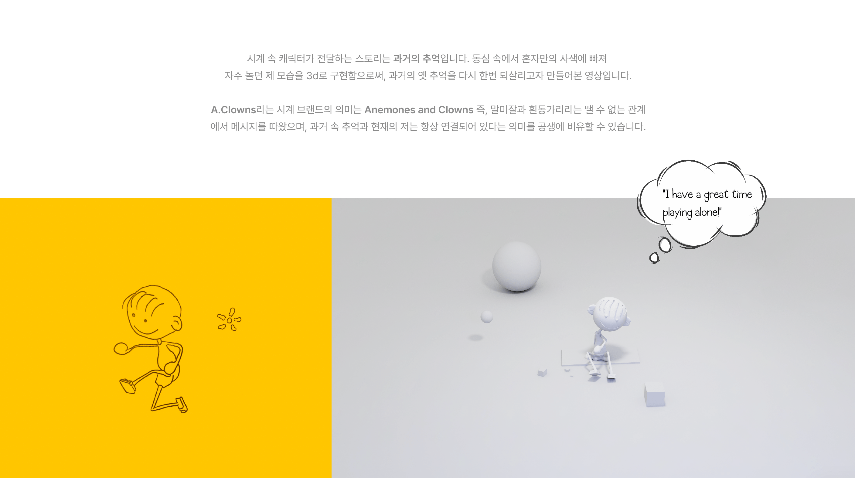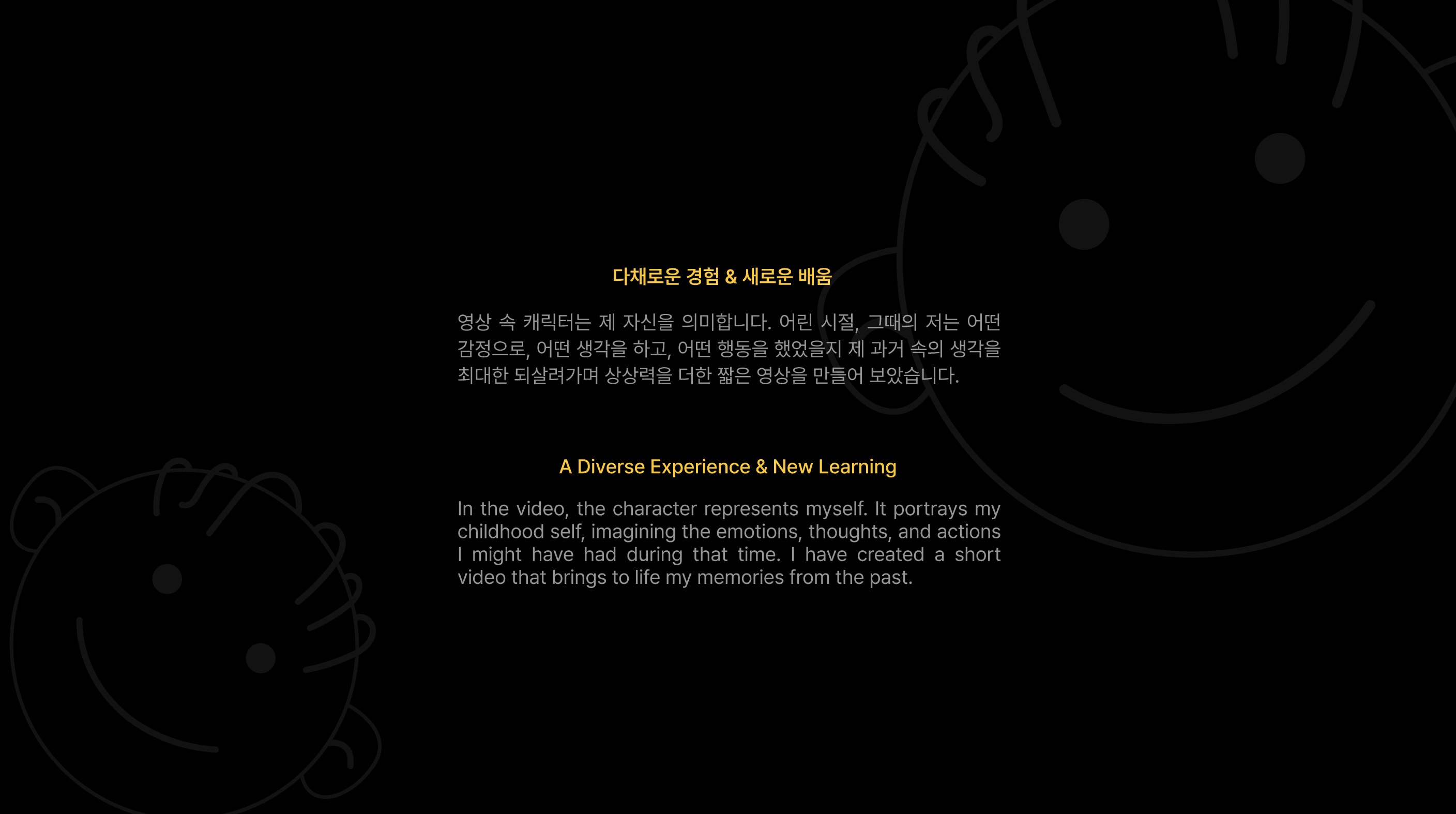 Who i am은 3가지의 제 이야기가 담긴 포트폴리오입니다. 시계, 건축물, 자연으로부터 느낀 이야기를 현재형으로 서술해 보았으며, 과거의 동심 속 추억을 회상하는 내용을, 어린아이가 전달하는 느낌을 최대한 표현하고자 카툰 스타일로 표현해 보았습니다. 영상 속 캐릭터는 제 자신을 의미합니다. 어린 시절, 그때의 저는 어떤 감정으로, 어떤 생각을 하고, 어떤 행동을 했었을지 제 과거 속의 생각을 최대한 되살려 가며 상상력을 더한 짧은 영상을 만들어 보았습니다.