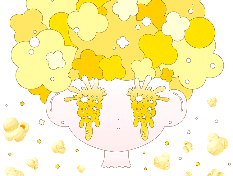 버블 껌 맛 팝콘의 패키지 디자인으로 팝콘 캐릭터가 풍선껌을 부는 모습으로 표현했습니다. '버블'이라는 이름에 맞게 수영하며 생기는 물방울 또한 표현해 보았습니다. 강선우 kangseonwoo0115@gmail.com seon.woo