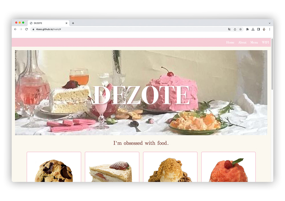디지털 프로그래밍 수업에서 함께 기말 프로젝트로 진행한 홈페이지 만들기입니다. 모두가 좋아하는 공통점을 찾다 보니 디저트에 대해서 만들게 된 홈페이지 이다. 첫 코딩이란 것을 배우면서 만들기는 쉽진 않은 여정이었으나 함께 진행하면서 코딩에 대해서 같이 새로운 것들을 배우고 느끼는 값진 시간이었다.